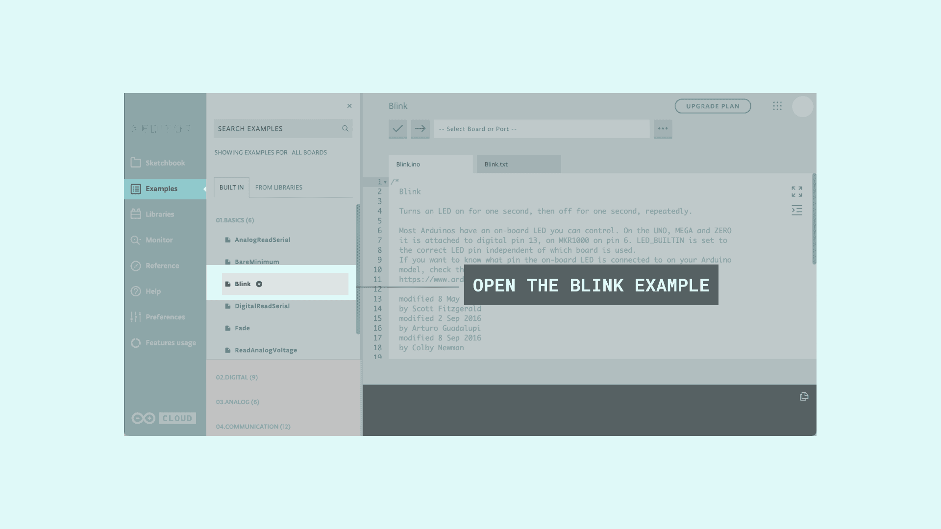 2. Let’s try an example: Choose Examples on the menu on the left (first column), then Basic and Blink. The Blink sketch is now displayed in the code area.
