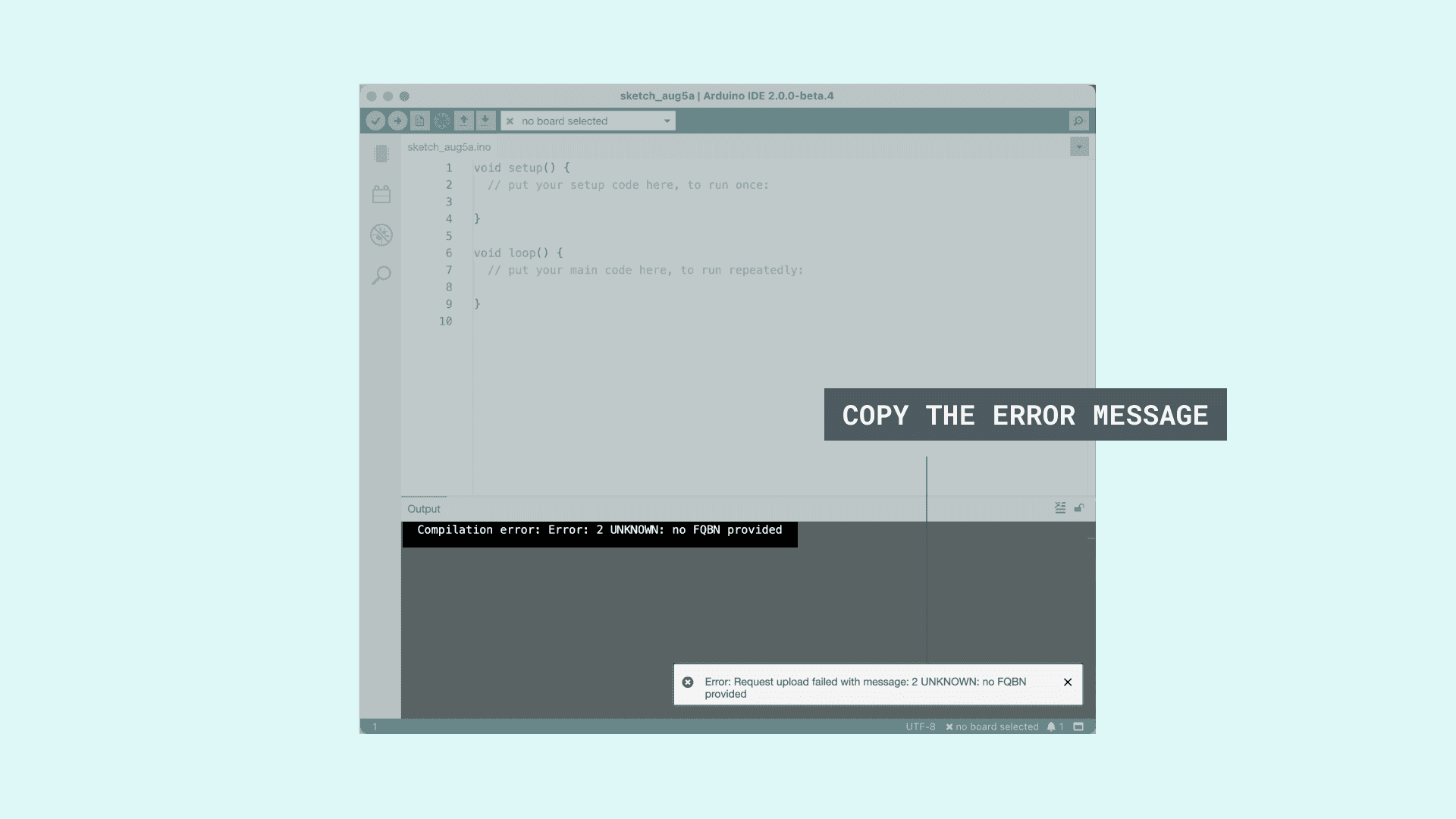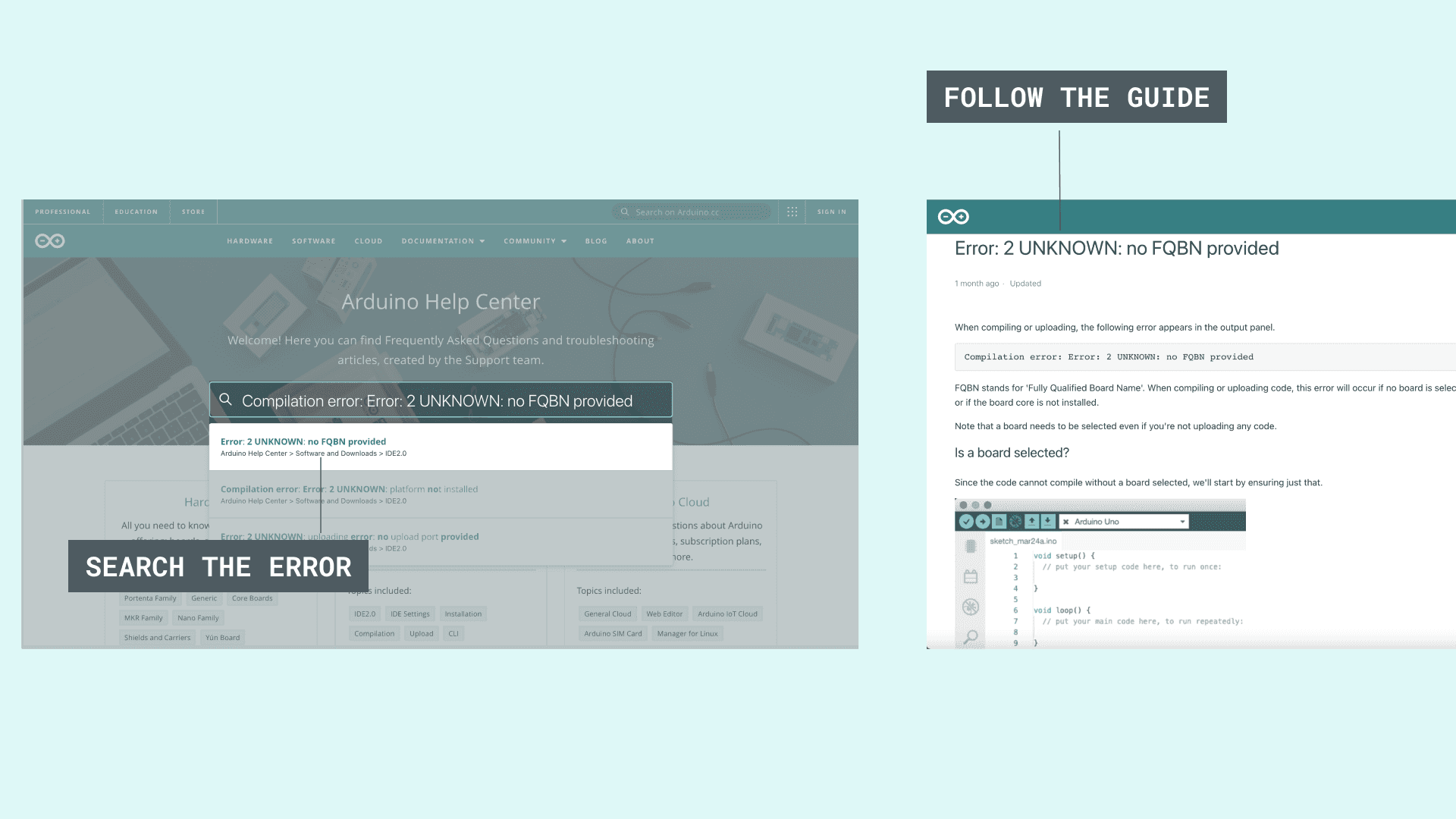 In the Arduino Help Center you will find articles on frequently asked questions, and troubleshooting guides for most of the errors you might encounter. You can use our help center by browsing through the different categories and the questions provided in each of them, or by searching your error in the search tab.