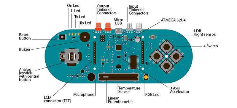 The Esplora has onboard sound and light outputs, and several input sensors, including a joystick, a slider, a temperature sensor, an accelerometer, a microphone, and a light sensor. It also has the potential to expand its capabilities with two Tinkerkit input and output connectors, and a socket for a color TFT LCD screen.