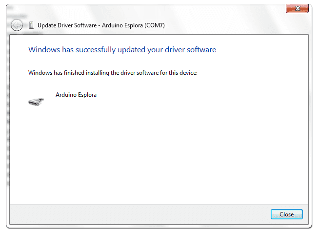 - After a few moments, a window will tell you the wizard has finished installing software for Arduino Esplora. Press the Close button.