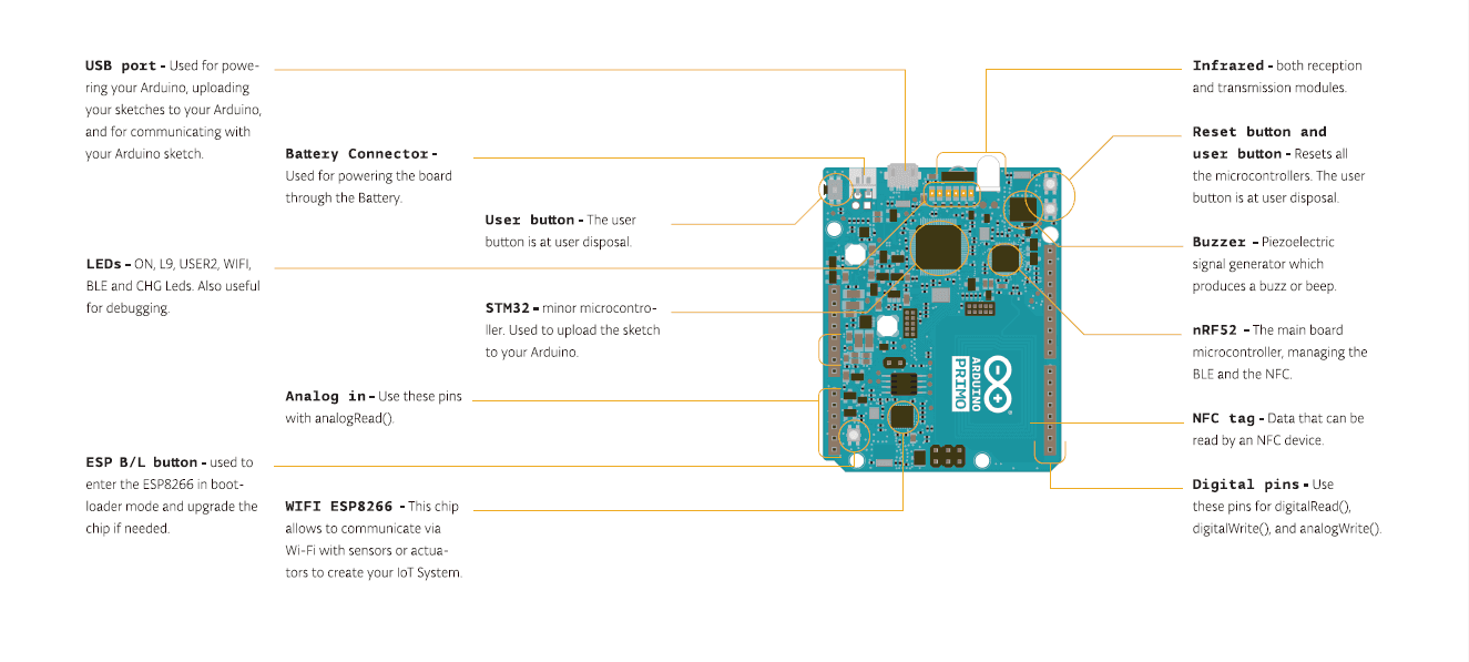 The Arduino Primo combines the processing power from the Nordic nRF52 processor, an Espressif ESP8266 for WiFi, as well as several on-board sensors and a battery charger. The nRF52 includes NFC (Near Field Communication) and Bluetooth® Smart. The sensors include an on-board button, LED and infrared receiver and transmitter.