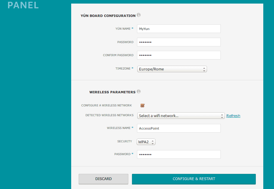 Open your browser and input the IP address of the Yún Shield; log into the shield with your password and get to the main panel.