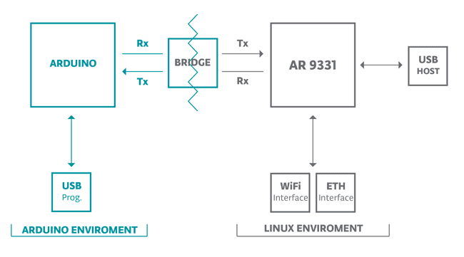 The Bridge library enables communication between Arduino and OpenWRT. There are several different utility classes that facilitate different kinds of communication between the two, described below, and more in depth on the Bridge library reference pages.