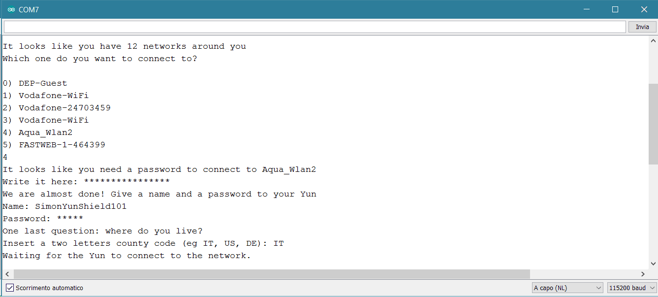 The blue LED on the shield will start to blink after a while; when the scanning process is over, the sketch will offer all the available APs in a numbered list. The time required to scan the network depends on the number of APs and their signal strength. You choose the AP to use typing in the input field the corresponding number. Please remember to enable "NewLine" in the Serial Monitor as End of Line.