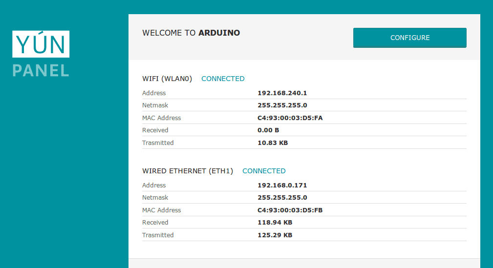 http://arduino.local or 192.168.240.1 in the address bar. After a few moments, a web page will appear asking for a password. Enter "arduino" and click the Log In button.You will find a page with some diagnostic information about the current network connections. The first is your WiFi interface, the second is your ethernet connection. Press the Configuration button to proceed.