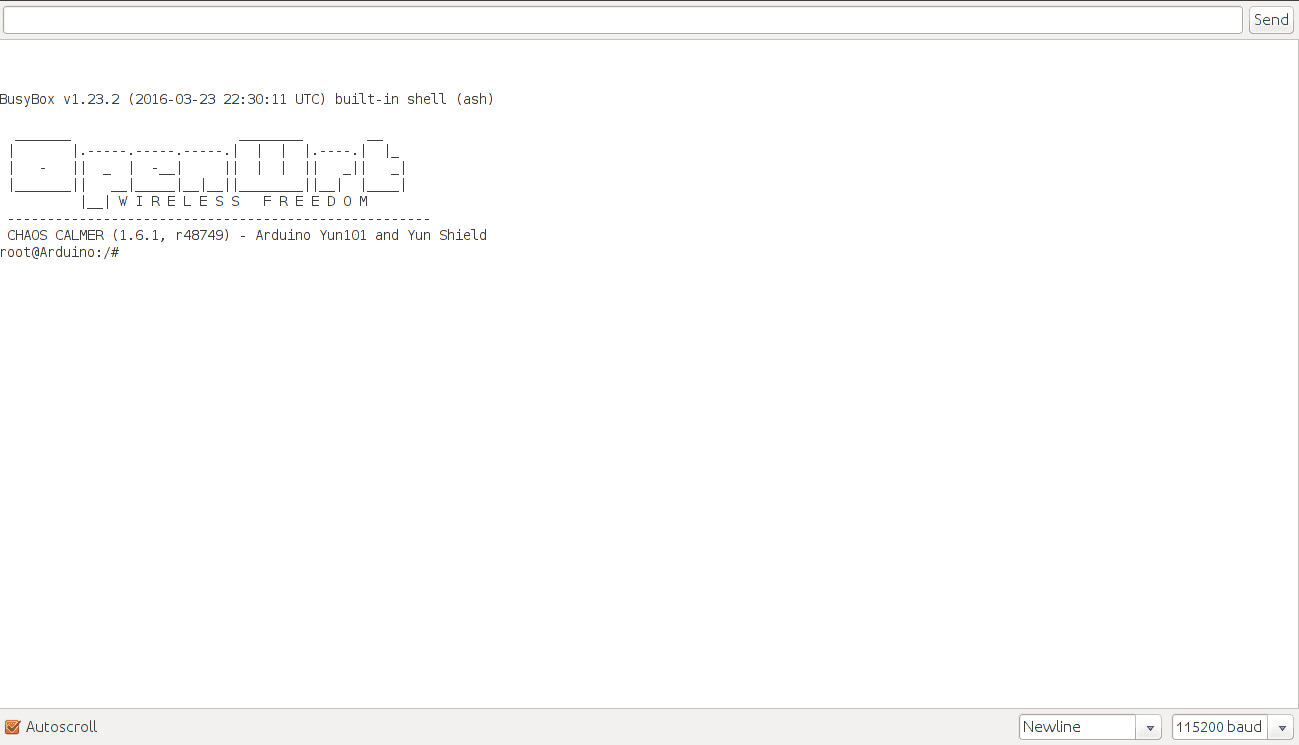 The webpanel password can be reset and changed. Connect the Arduino Yún Shield to your computer with an USB cable and upload the YunSerialTerminal sketch. It can be found in the Bridge examples in the Arduino IDE. When the Yún Shield boot is complete, open the serial monitor, select New Line character in the dropdown menu and press Enter. Something like this should appear in your serial monitor: