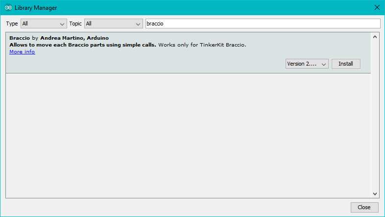 To use your TinkerKit Braccio you need to load the Braccio library using the Library manager of the Arduino Software (IDE); see these instructions for details on installing libraries.