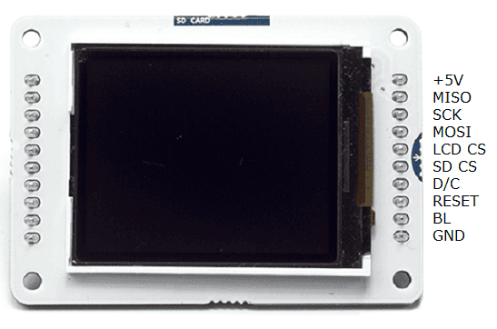 The screen can be configured for use in two ways. One is to use an Arduino's hardware SPI interface. The other is to declare all the pins manually. There is no difference in the functionality of the screen between the two methods, but using hardware SPI is significantly faster when drawing.