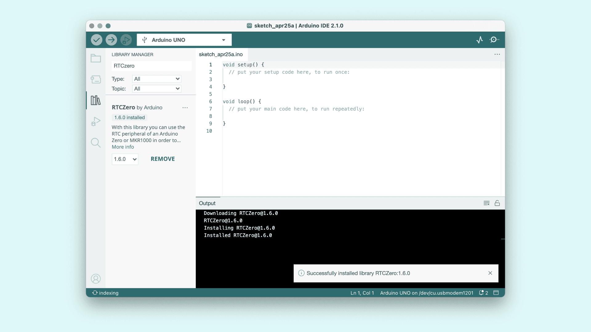Almost all libraries come with already made examples that you can use. These are accessible through File > Examples > {Library} > {Example}. In this example, we are choosing the RTCZero > SimpleRTC.