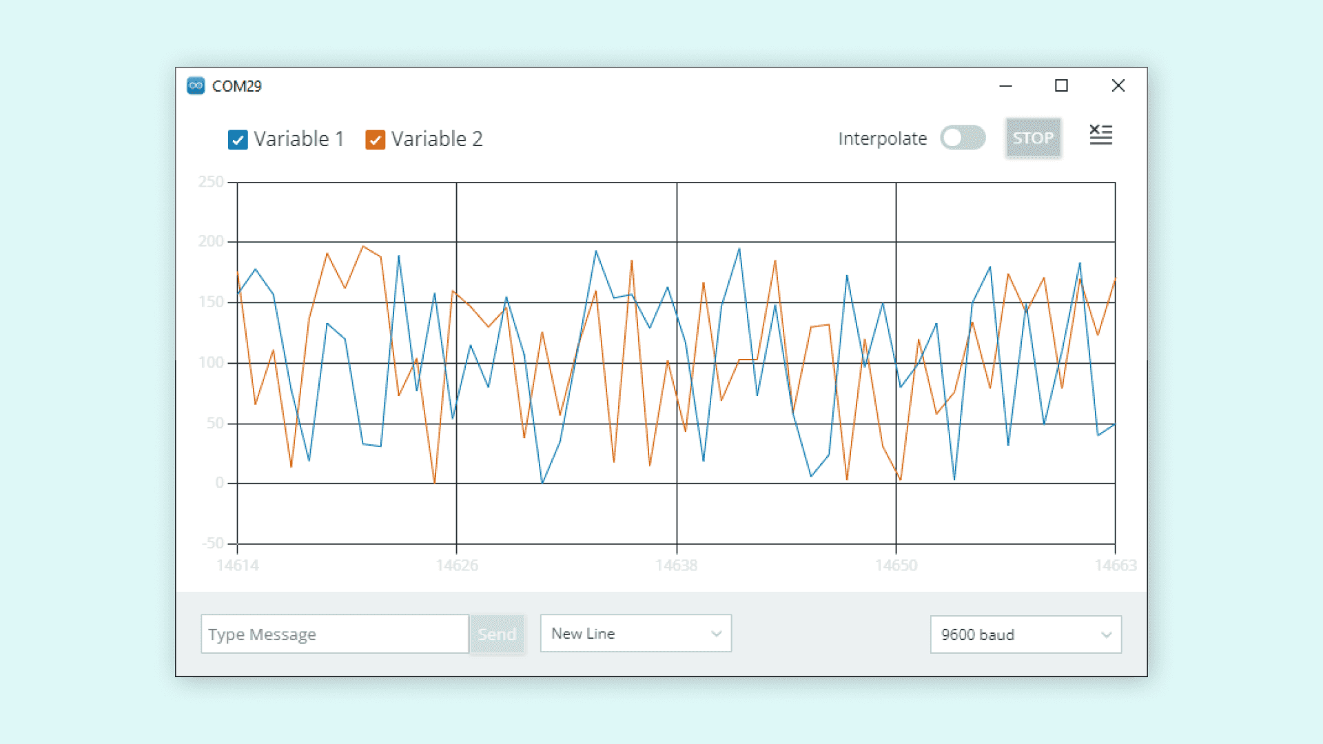 11 Serial.print("Variable_1:");12 Serial.print(random_variable);13 Serial.print(",");14 Serial.print("Variable_2:");15 Serial.println(static_variable);16}The Serial Plotter recognizes only CRLF