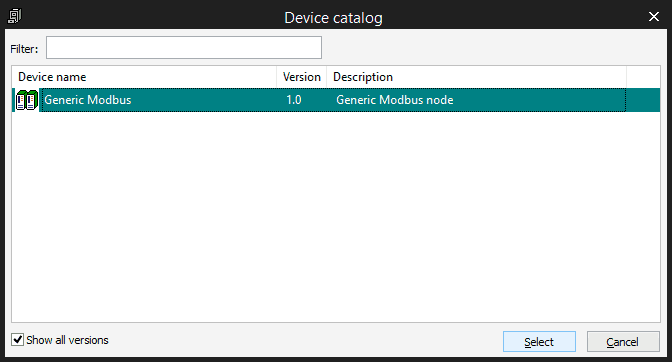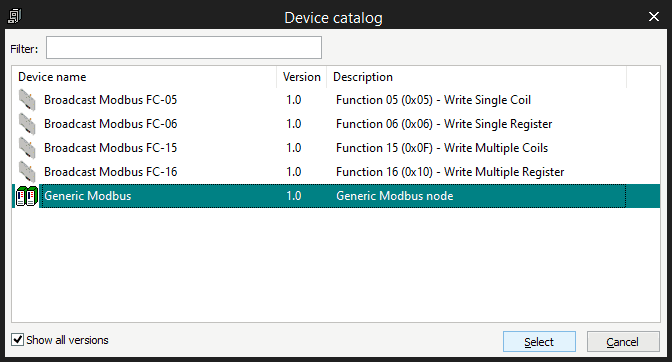 Then you can attach some functions to the Generic Modbus item, they will appear also in the Catalog Tile Window, you need to select first the Generic Modbus device