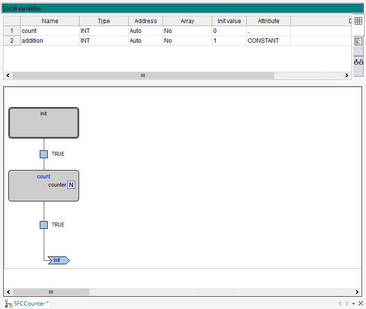 The counter program should look like the following picture. Note the action inside the "count" Step: you can see a small "counter" text which is the action's name of the program done in Structured Text which code is the same as shown in the Structured Text section.