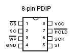 The AT25HP512 is a 65,536 byte serial EEPROM. It supports SPI modes 0 and 3, runs at up to 10MHz at 5v and can run at slower speeds down to 1.8v. It's memory is organized as 512 pages of 128 bytes each. It can only be written 128 bytes at a time, but it can be read 1-128 bytes at a time. The device also offers various degerees of write protection and a hold pin, but we won't be covering those in this tutorial.