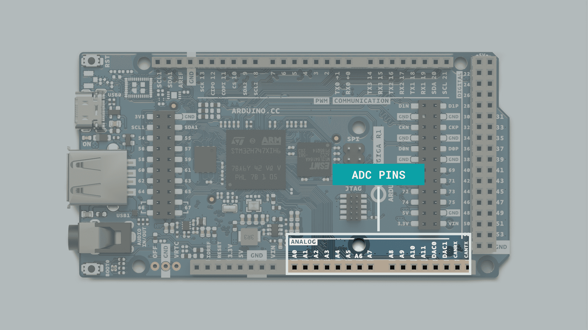An analog-to-digital converter (ADC) is a device that converts an analog voltage, or signal, into digital data. The GIGA R1 microcontroller, the STM32H747XI, embeds three ADCs whose resolution can be configured to 8, 10, 12, 14, or 16 bits. Each ADC shares up to 20 external channels that can be accessed in the GIGA R1 board through pins