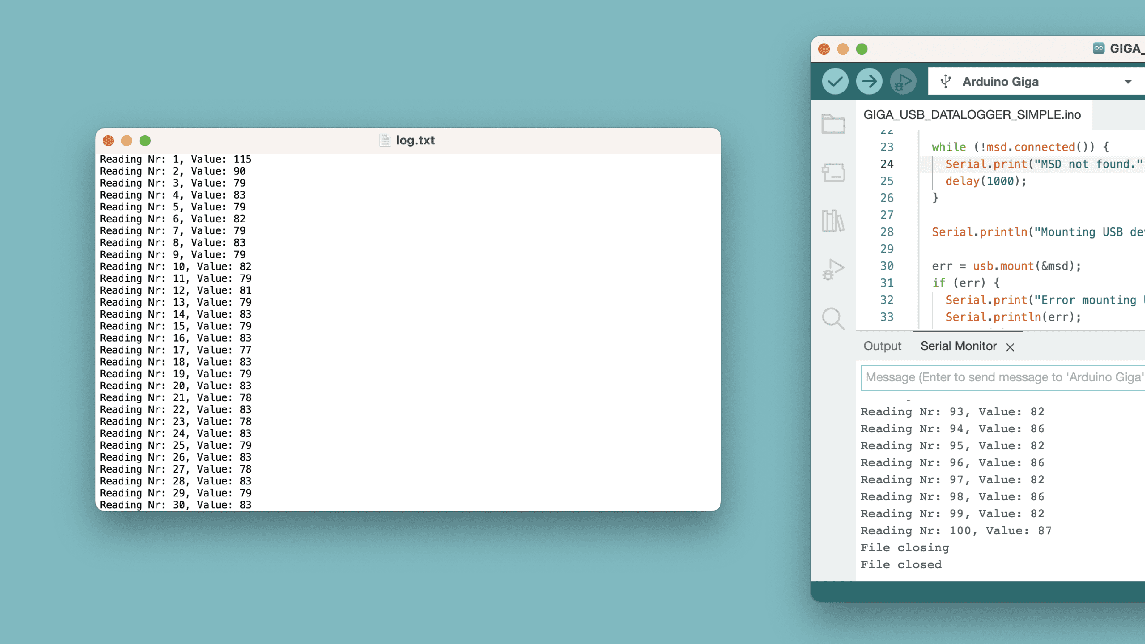 83 if (err < 0) {84 Serial.print("fclose error:");85 Serial.print(strerror(errno));86 Serial.print(" (");87 Serial.print(-errno);88 Serial.print(")");89 } else {90 Serial.println("File closed");91 }92}After logging data, remove the USB stick from your board, and insert it in your computer to see the data logged: