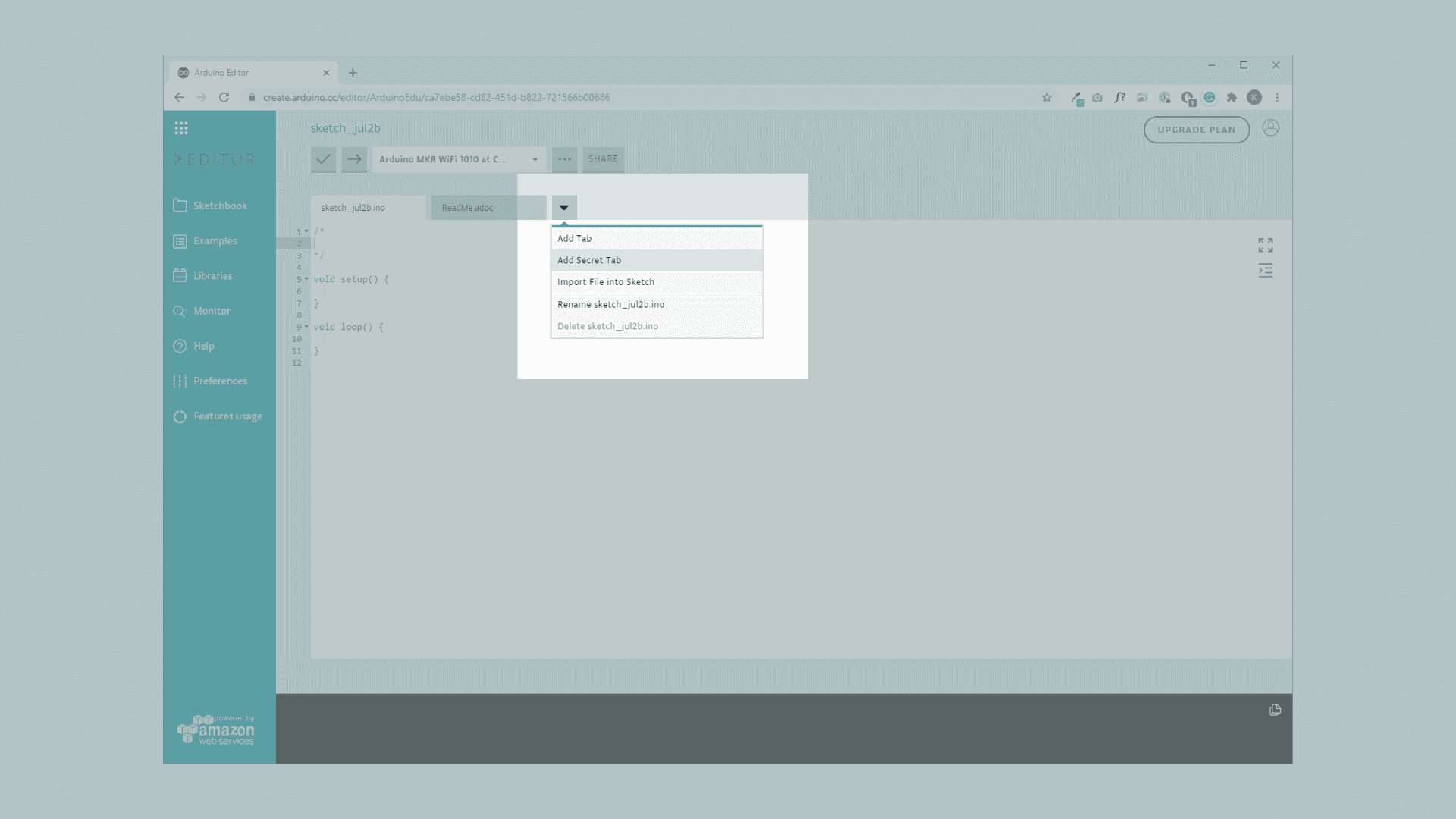 In the online editor, we need to click the downward arrow next to our sketch tab, and click "Add Secret Tab. This will create a tab called Secret.