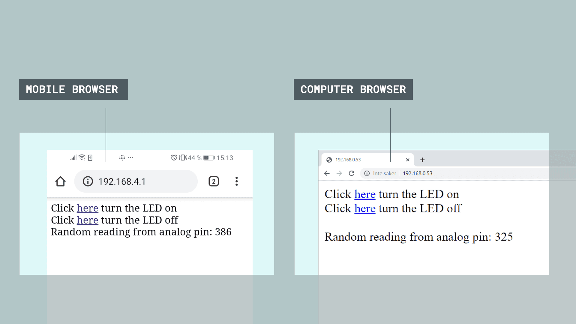 Once we are connected to the Wi-Fi, we can enter the URL (IP address of the board) in the browser. This is the one printed in the Serial Monitor. Now, we should see an almost empty page with two links at the top left that say "Click here to turn the LED on" and "Click here to turn the LED off", and a text saying: "Random reading from analog pin: xxx". Depending on if you are using a computer or a phone, they will look like the image below.
