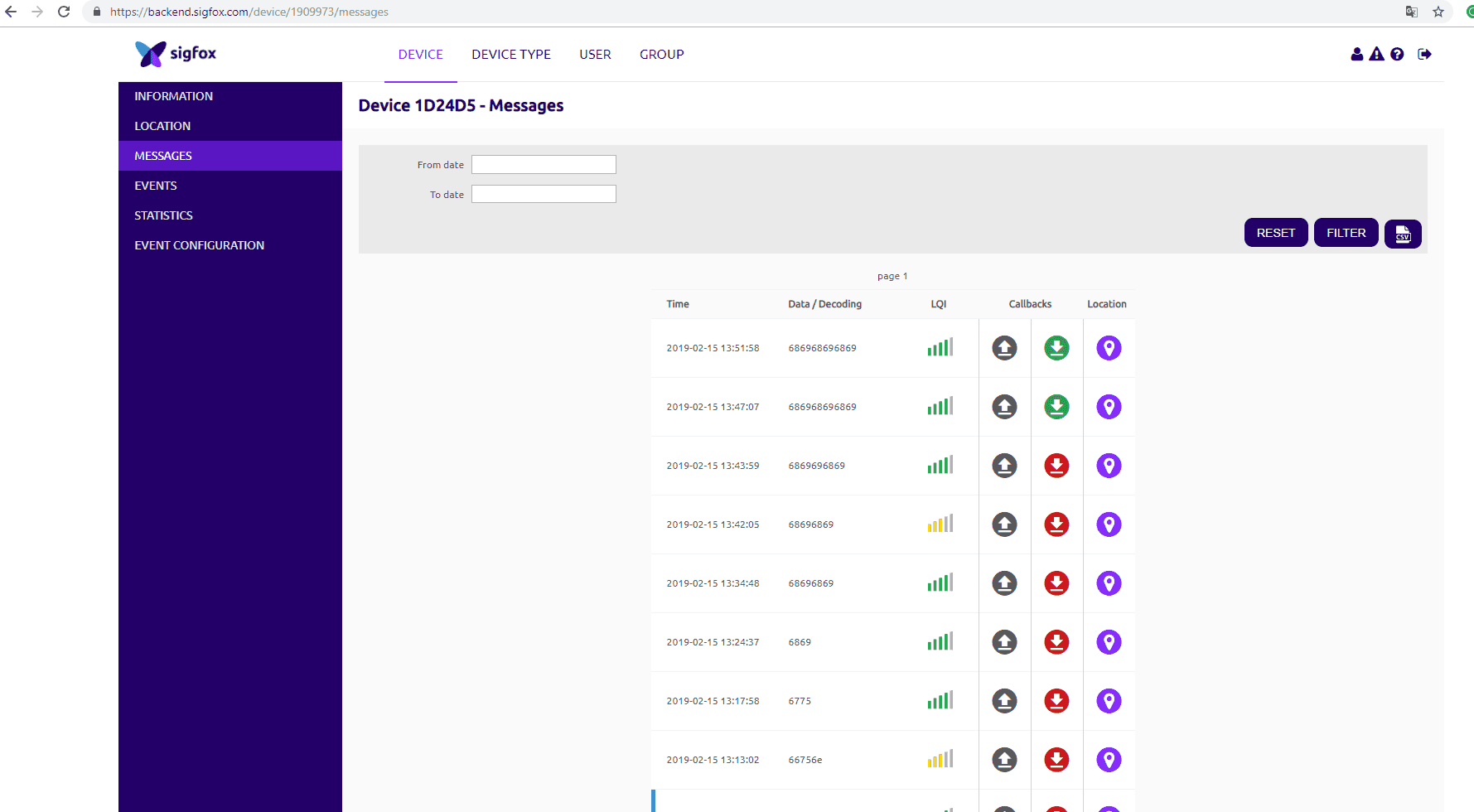 Now you can check the incoming and outgoing messages from the sigfox back end.