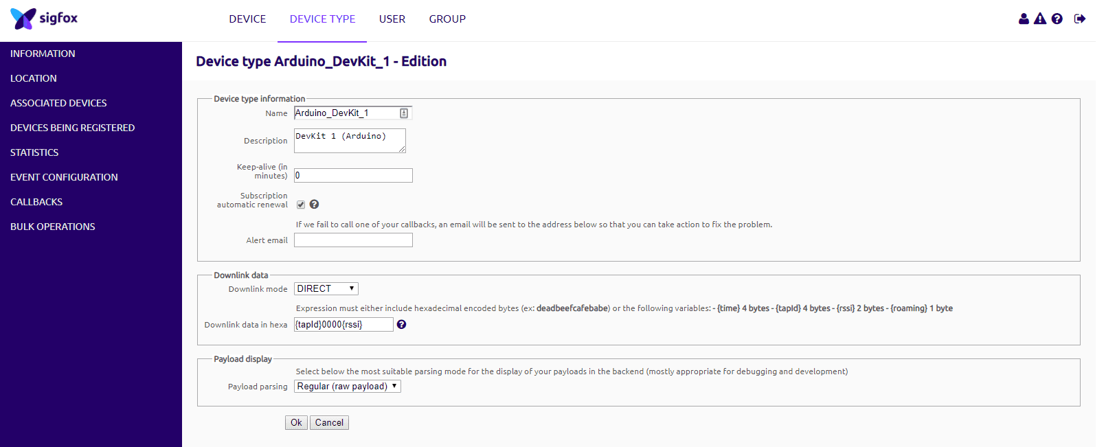 This example for a MKR FOX 1200 device allows you to setup the SigFox's backend for your board.