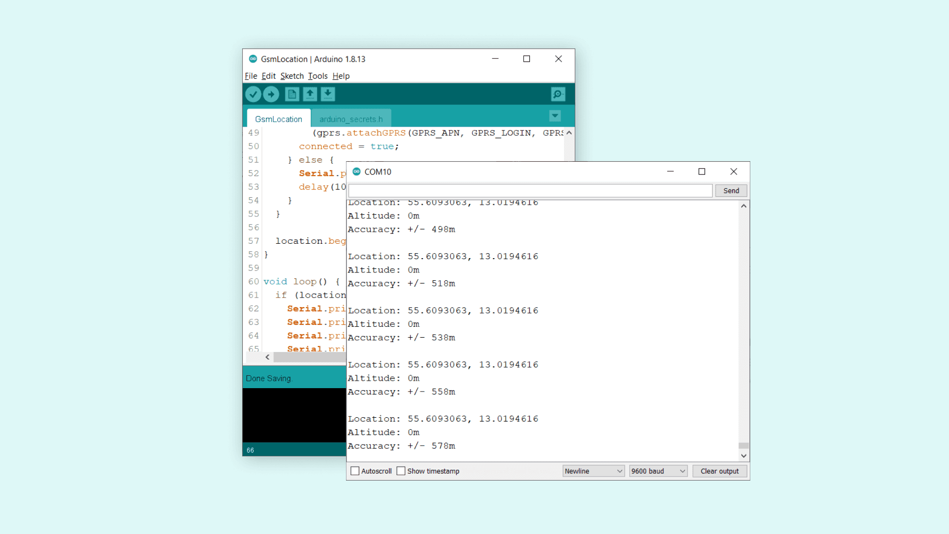 44void loop() {45 if (location.available()) {46 Serial.print("Location: ");47 Serial.print(location.latitude(), 7);48 Serial.print(", ");49 Serial.println(location.longitude(), 7);50