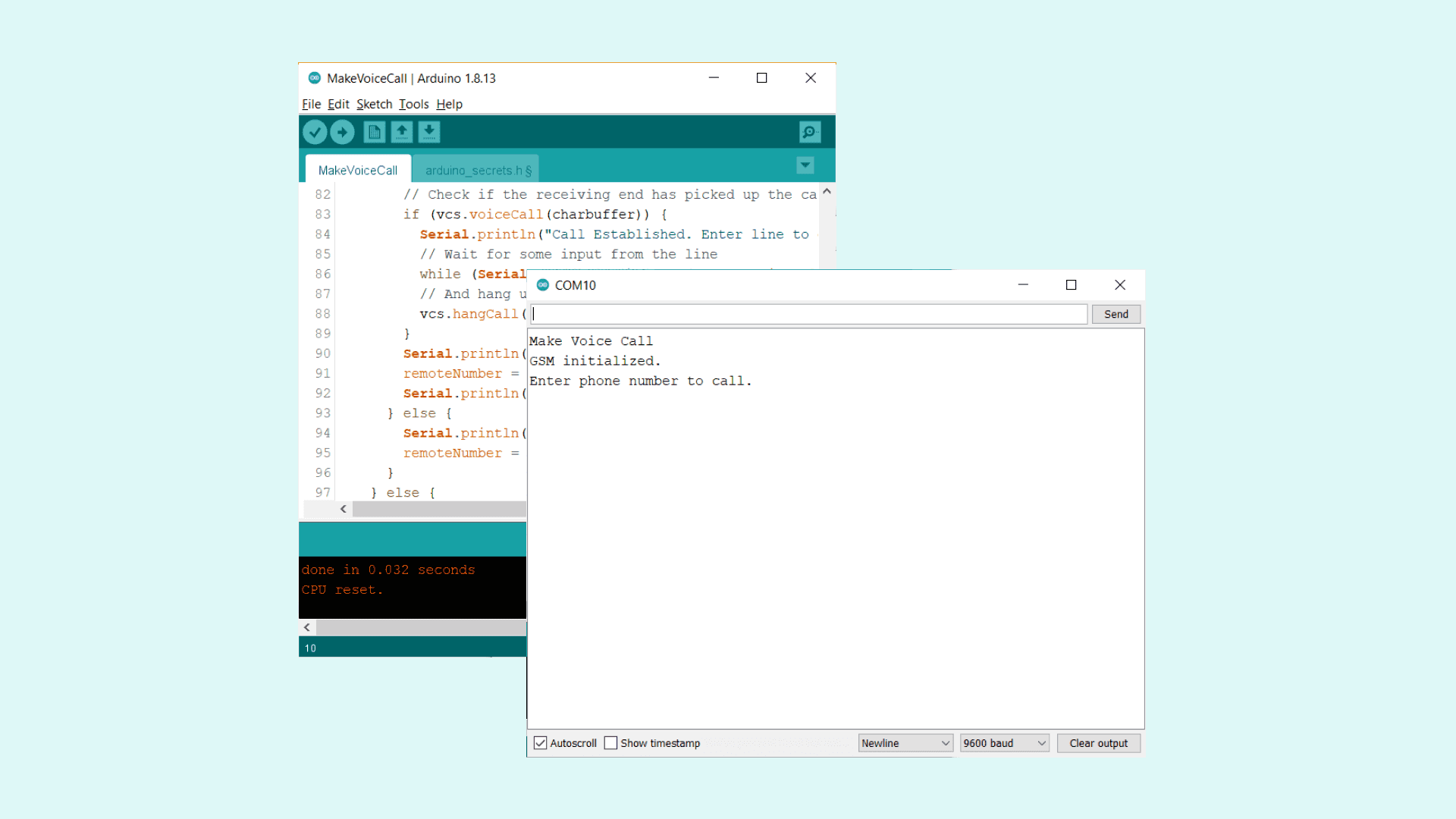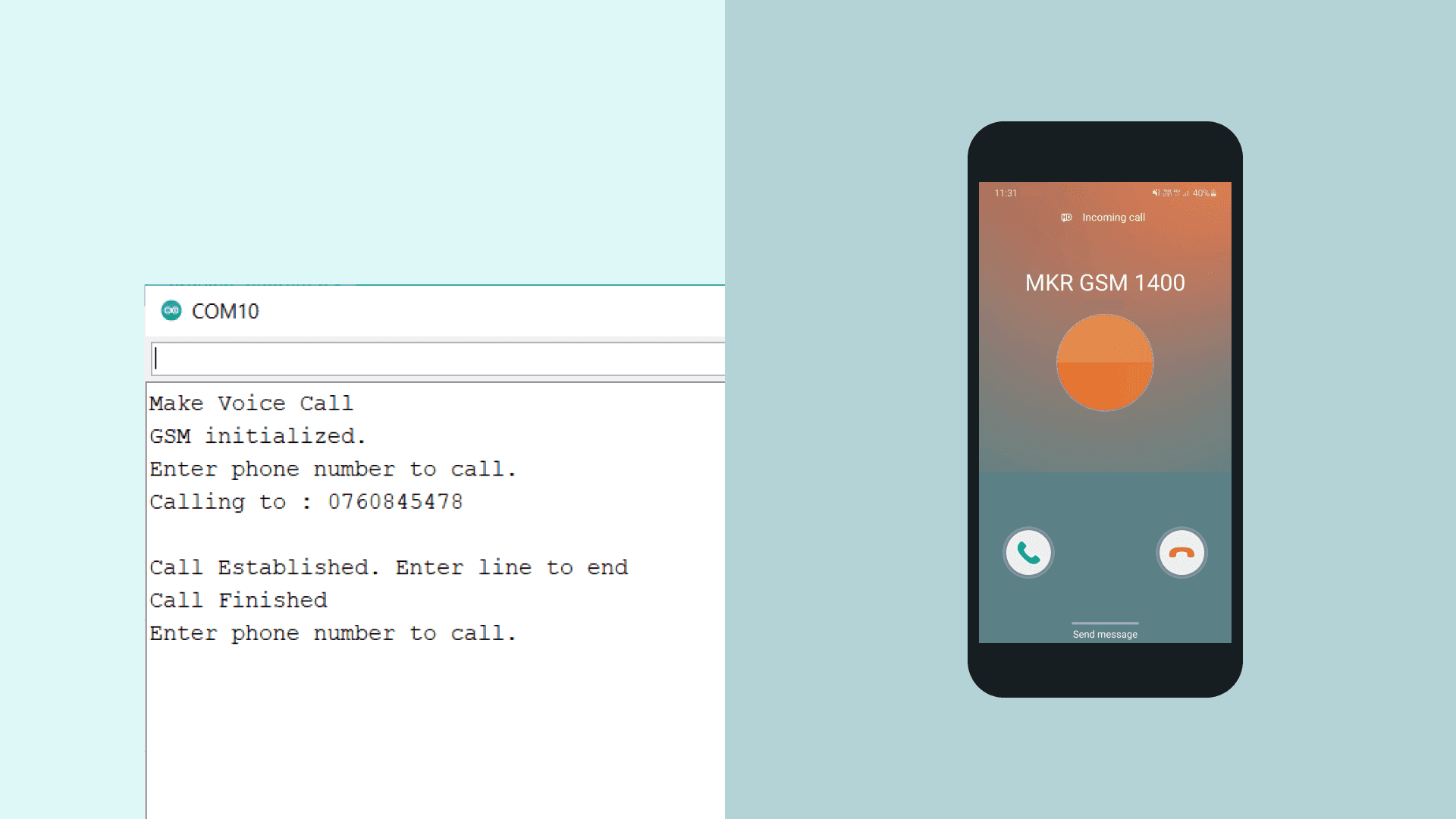 In this tutorial, we will use an example from the MKRGSM library called MakeVoiceCall. With it, we will set up the MKR GSM 1400 to create outgoing calls to a number of our liking. The example includes a serial interface that allows us to enter a number, place a call, and hang up on the call.