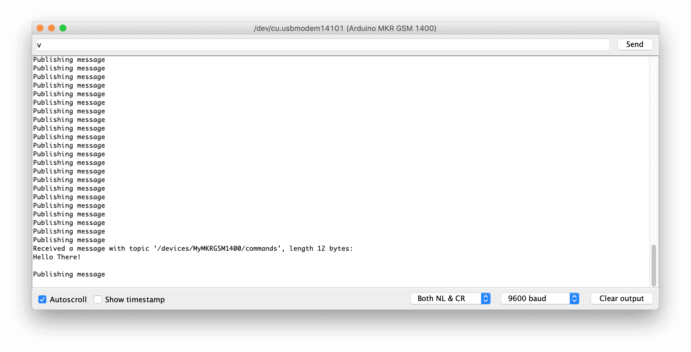In the screenshot above, the board was sending a "hello 464488" value, the 464488 value is the result of the millis() function on the board.