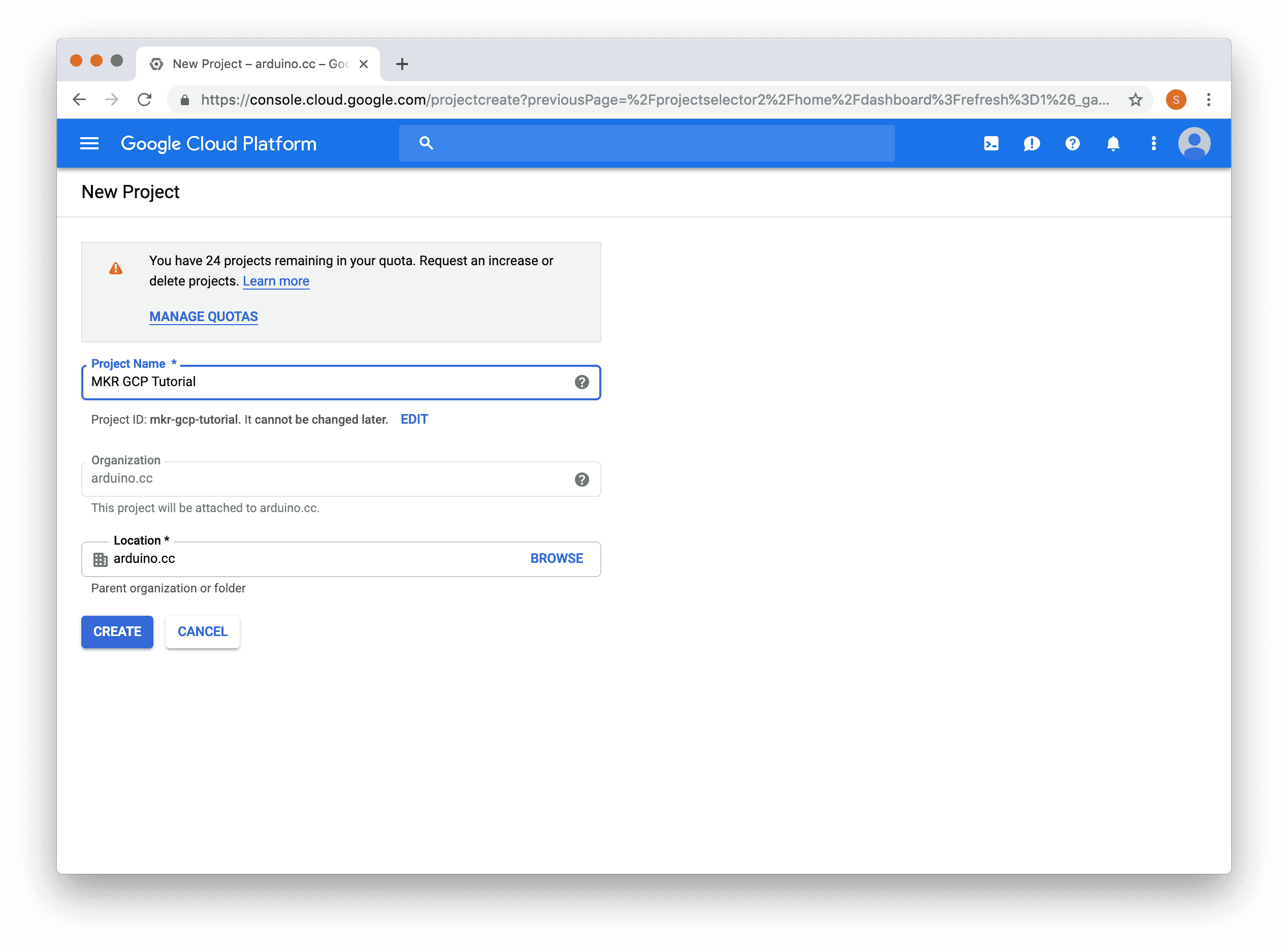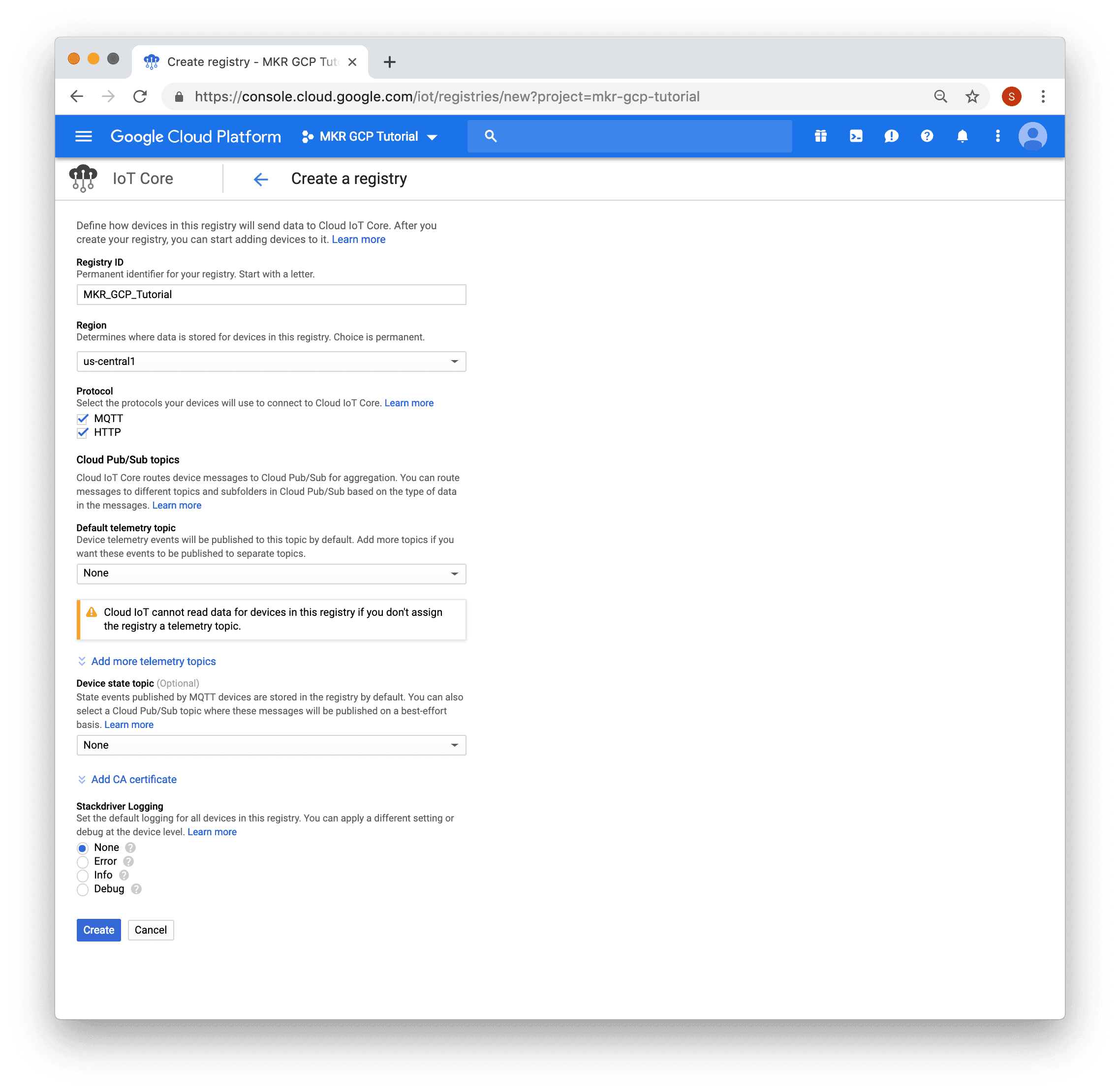 You will then be presented with a form. Fill in the "Registry ID", select a region. In the screenshot below "MKR_GCP_Tutorial" was entered for the registry ID and "us-central1" was selected as the region. After the form has been filled in, click the "Create" button.