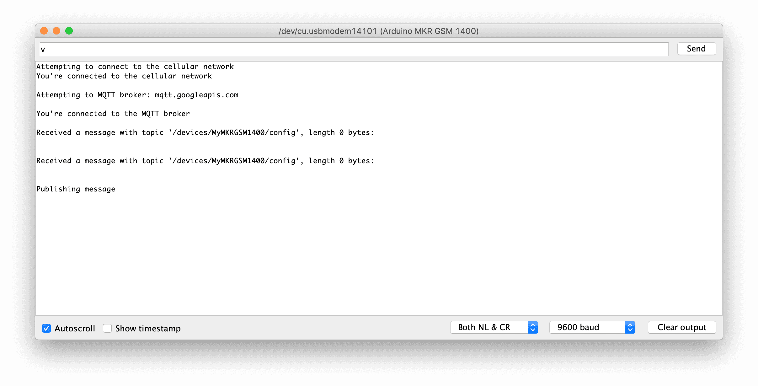 1#define SECRET_PROJECT_ID "mkr-gcp-tutorial"2#define SECRET_CLOUD_REGION "us-central1"3#define SECRET_REGISTRY_ID "MKR_GCP_Tutorial"4#define SECRET_DEVICE_ID "MyMKRGSM1400"5) Upload the sketch below to your board and open the serial monitor. The board will attempt to connect to the cellular network and if successful try to connect to GCP IoT Core using MQTT.