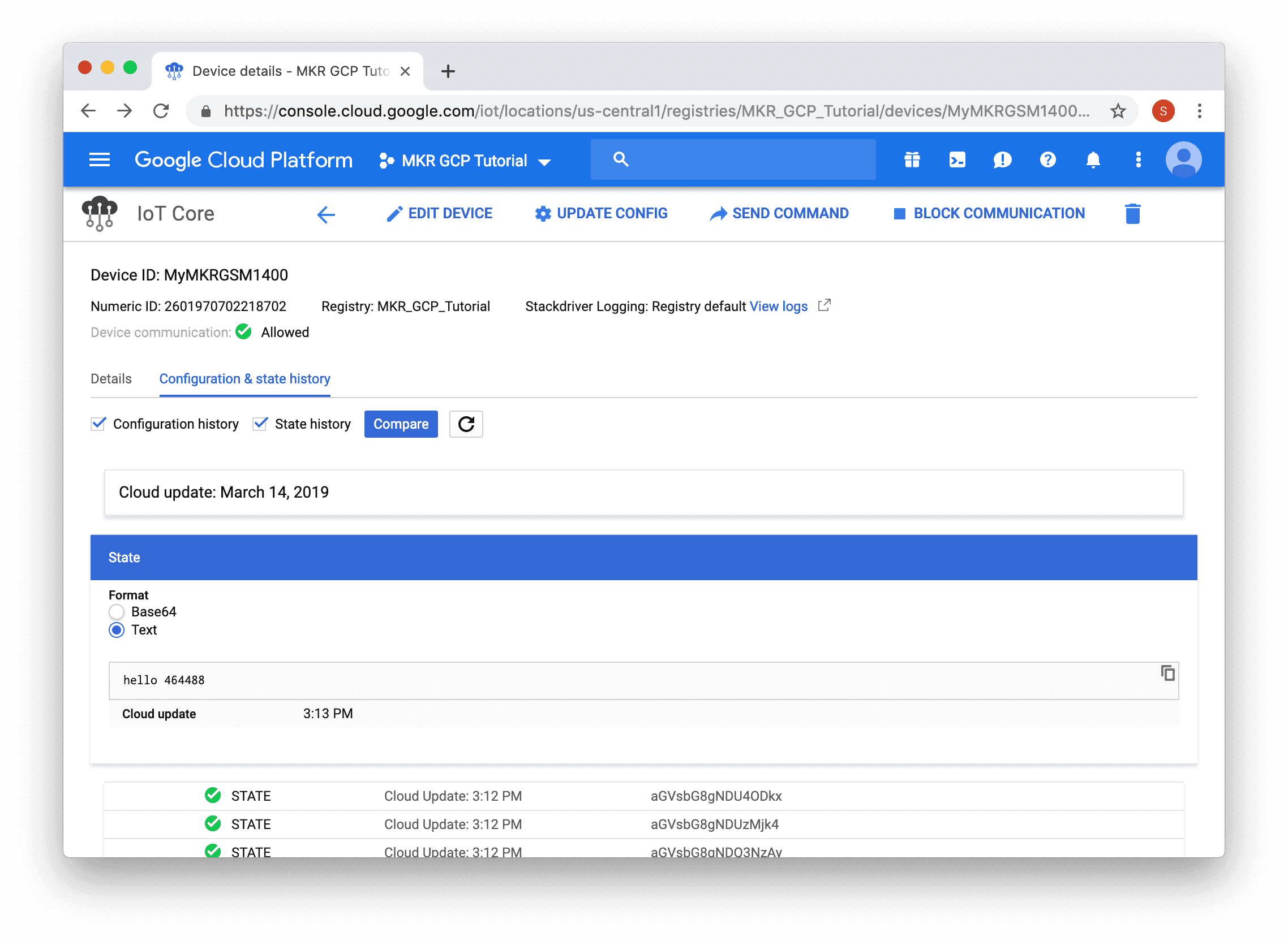 Now that your board has successfully connected to GCP IoT Core, we can use the GCP IoT Core console to interact with it. The sketch sends a message to the /devices/{deviceId}/state topic every 5 seconds and listens for messages on both /devices/{deviceId}/config topic and /devices/{deviceId}/commands/# topics.