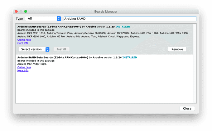 Once it is installed, make sure you have the latest "Arduino SAMD Boards" package installed. You can check by opening the Arduino IDE, and opening the Tools -> Board: "..." -> Board Manager... menu entry, and searching for "Arduino SAMD". At the time of writing 1.6.20 was the latest version.