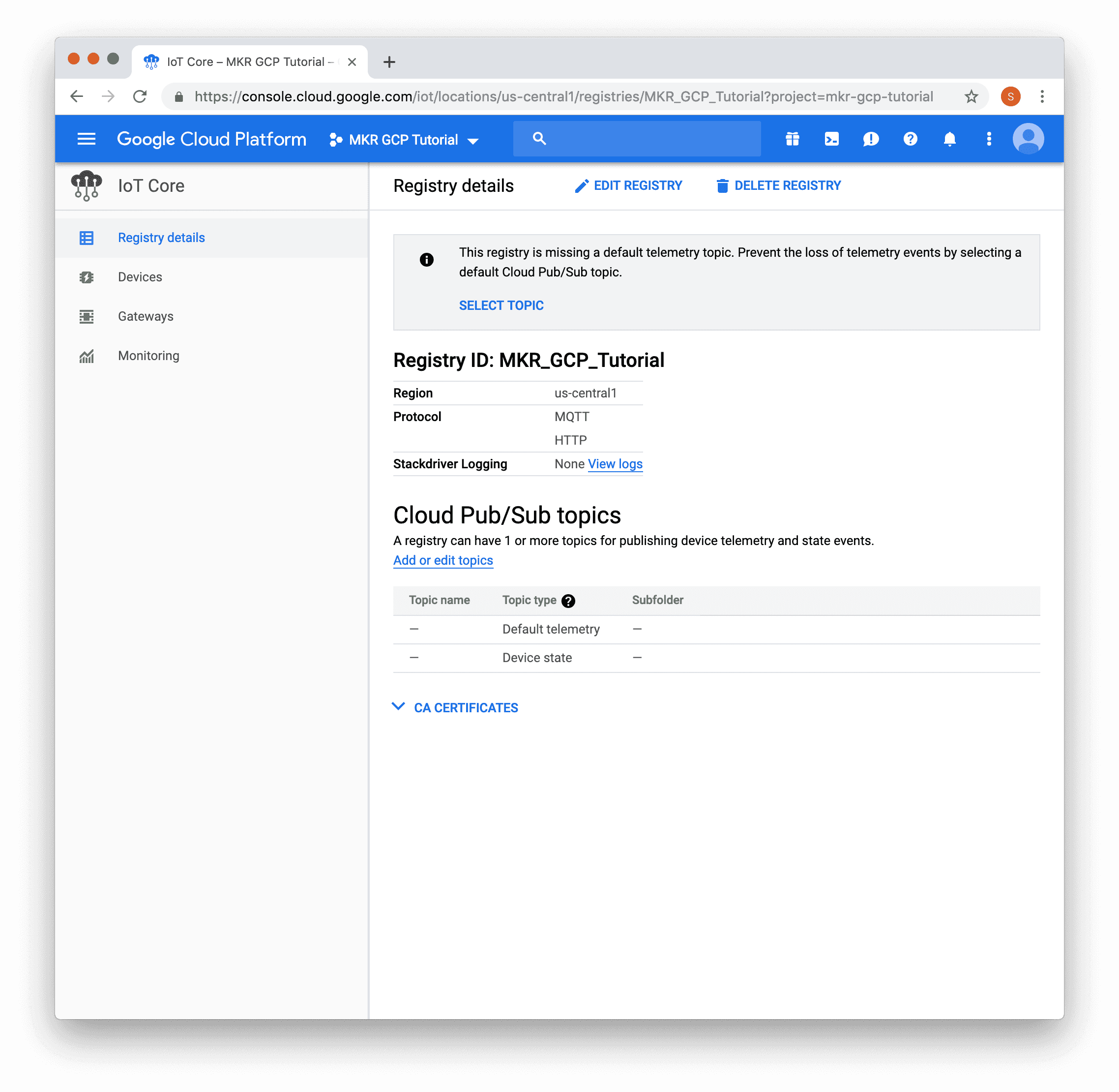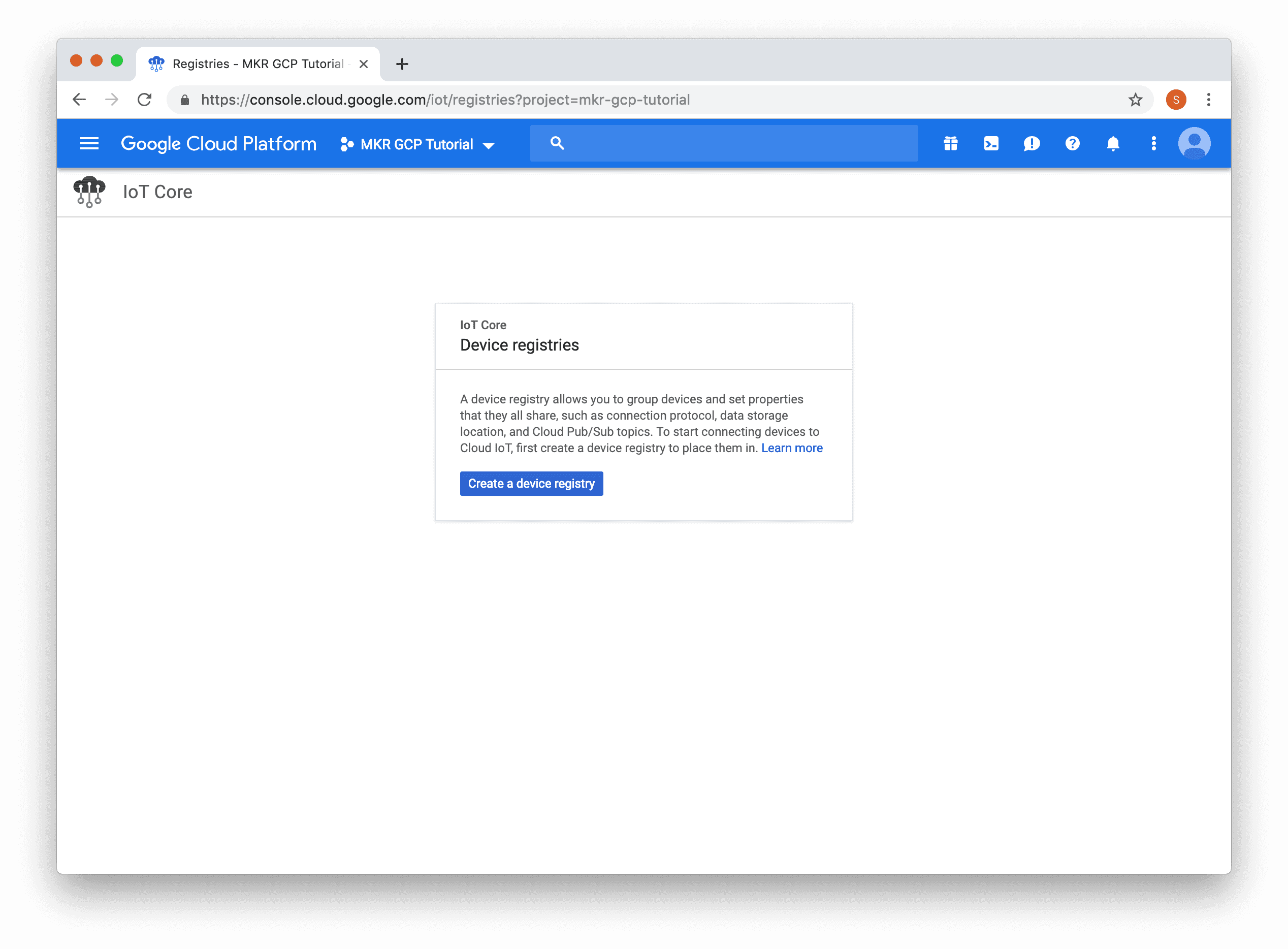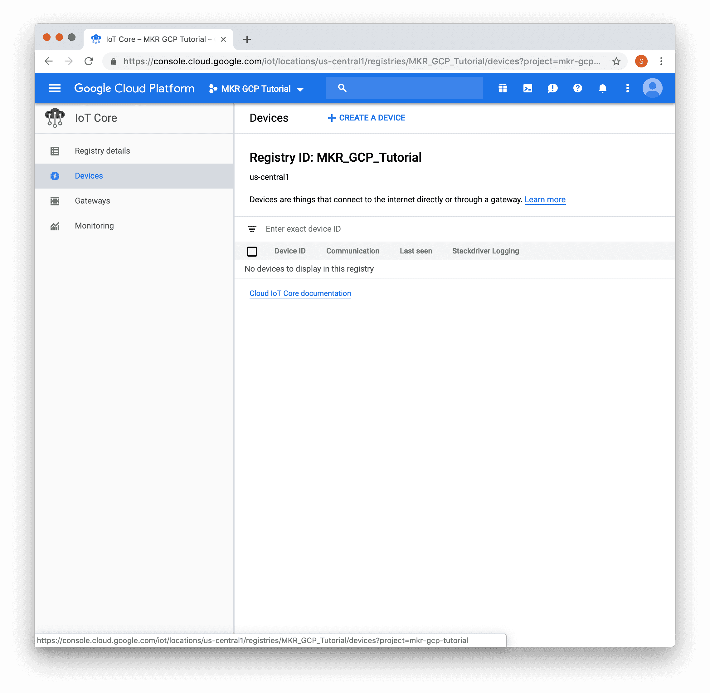 Once the API is enabled, you will be prompted to create a device registry.