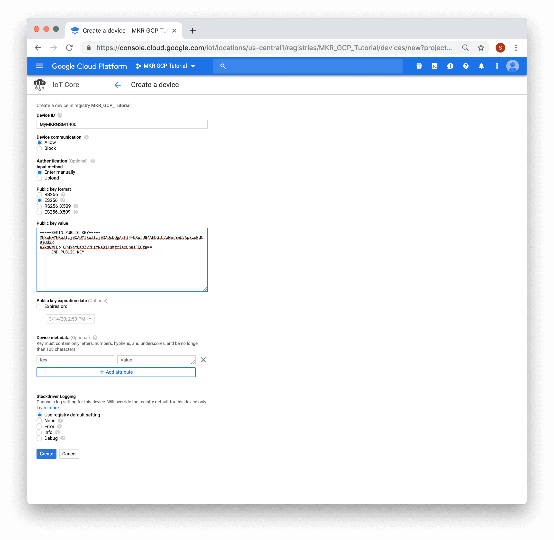 Enter the device name, in the screenshot below "MyMKRGSM1400" was used. "ES256" must be selected as the "Public key format". Paste the PEM public key generated on the board earlier into the "Public key value" text area. Then click the "Create" button.
