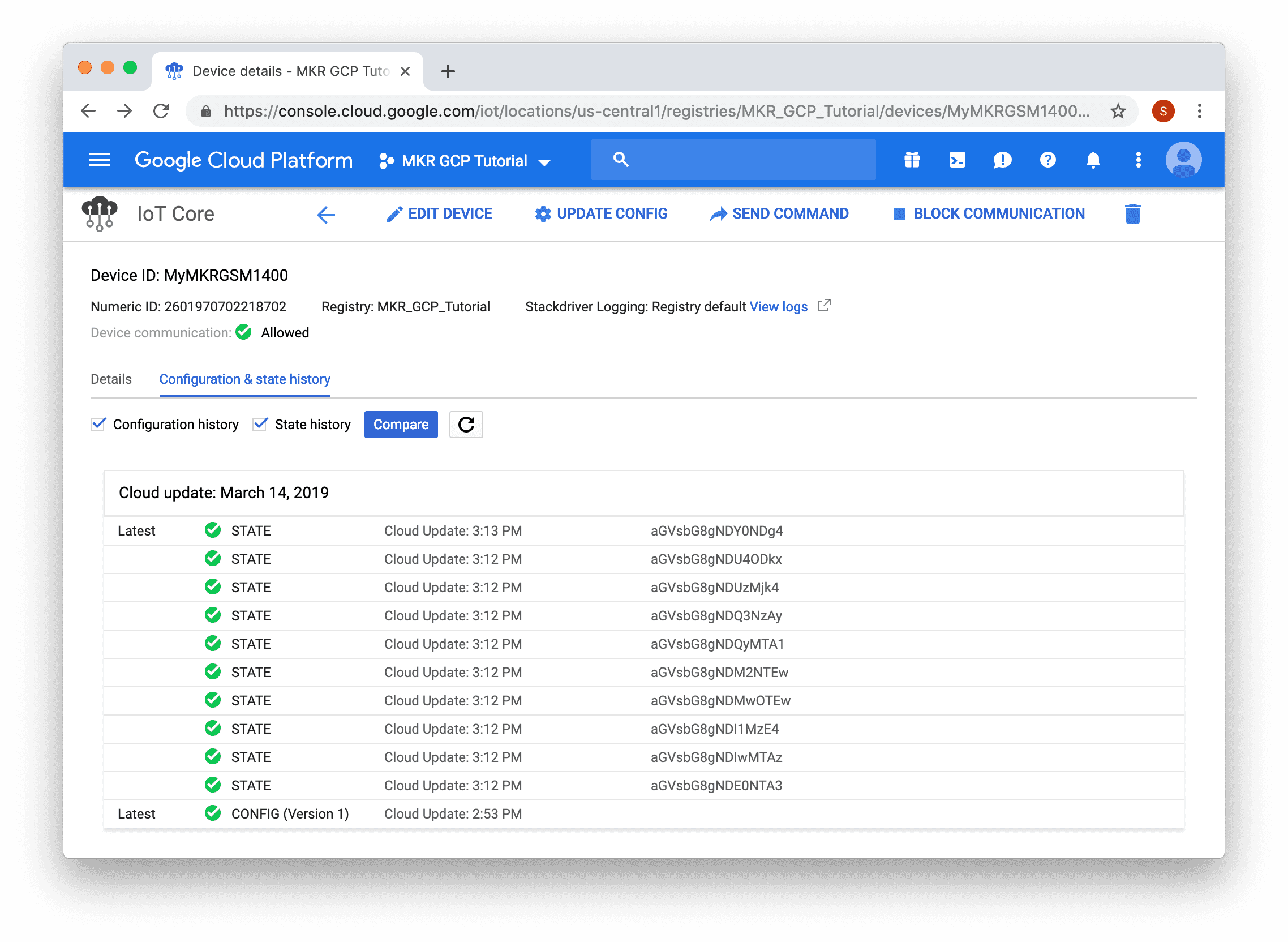 To view the messages the board is sending, click "Configuration & state history" tab.