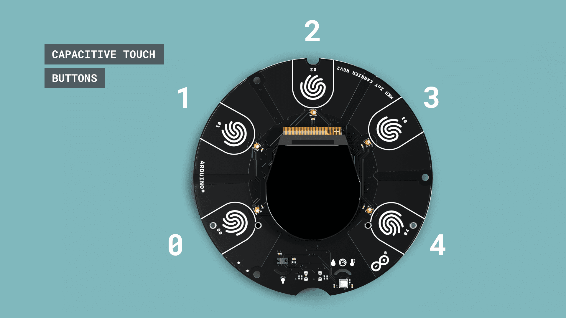 The carrier has five capacitive touch buttons on its top side, numbered from 0 to 4. The buttons are sensitive to direct touch and can also detect wireless touch.