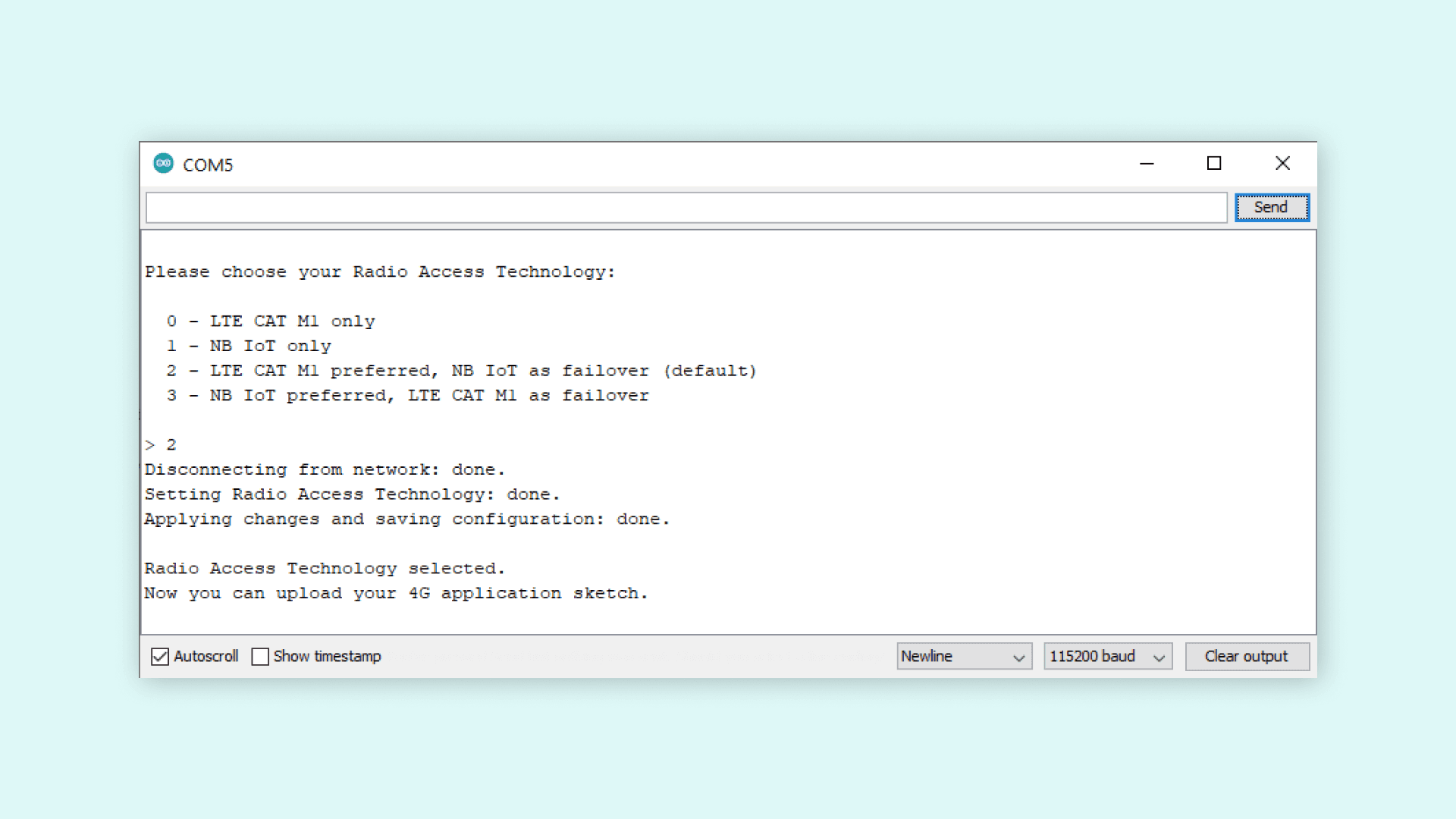 3void setup() {4 Serial.begin(115200);5 while (!Serial);6 MODEM.begin();7 while (!MODEM.noop());8 Serial.println();9 Serial.println("Please choose your Radio Access Technology:");10 Serial.println();11 Serial.println(" 0 - LTE CAT M1 only");12 Serial.println(" 1 - NB IoT only");13 Serial.println(" 2 - LTE CAT M1 preferred, NB IoT as failover (default)");14 Serial.println(" 3 - NB IoT preferred, LTE CAT M1 as failover");15 Serial.println();16}In the loop() function, we read the answer given in the serial monitor, giving a variable the appropriate value so that the right setting will be applied to the internal memory. Calling on our custom functions and sending the appropriate variables at the end.