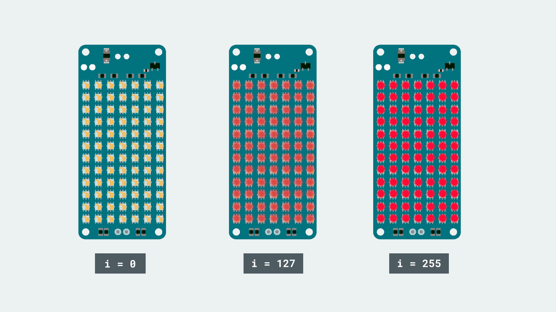 13 for (int i = 0; i <= 255; i++) {14 MATRIX.beginDraw();15 MATRIX.fill(i, 0, 0);16 MATRIX.rect(0, 0, MATRIX.width(), MATRIX.height());17 MATRIX.endDraw();18 delay(10);19 }20