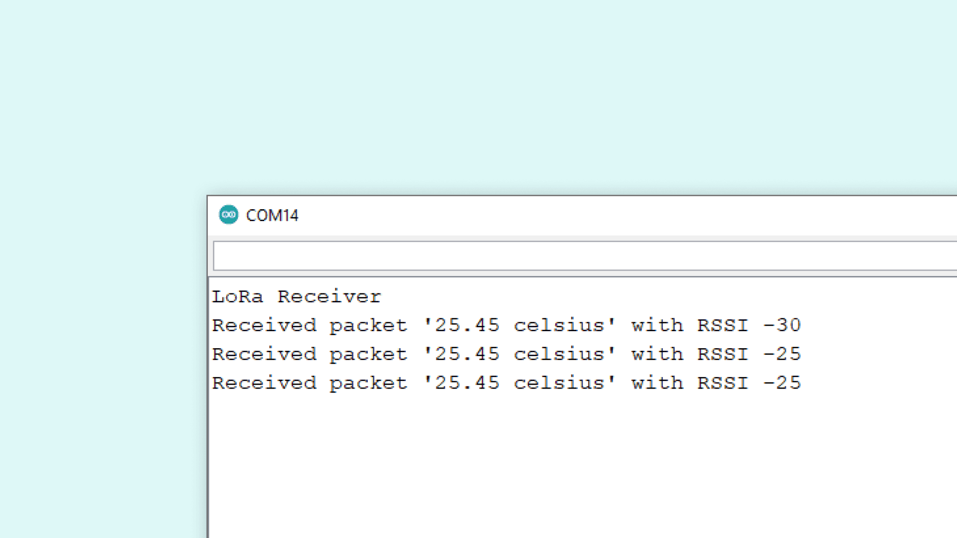 After we have uploaded the code to the receiver, we need to open the Serial Monitor to initialize the program. If everything works, we should now pick up the package we sent from the other device. The package contains the temperature, followed by RSSI (Received Signal Strength Indication). The closer this value is to 0, the stronger the signal are.