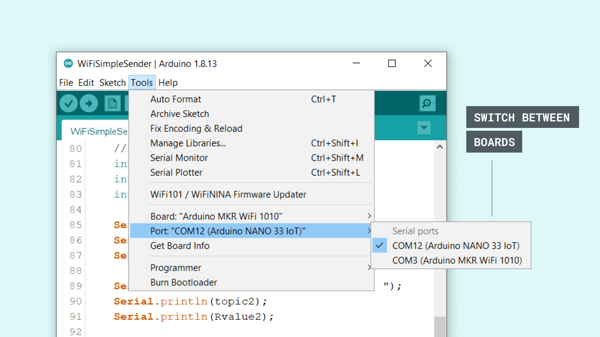SECRET_SSID (network name) and SECRET_PASS (password) needs to be replaced by your own credentials.1#define SECRET_SSID ""2#define SECRET_PASS ""We can now copy and paste the sender code below into our regular sketch file, and upload it to our board. Make sure we have selected the right port and board before uploading.