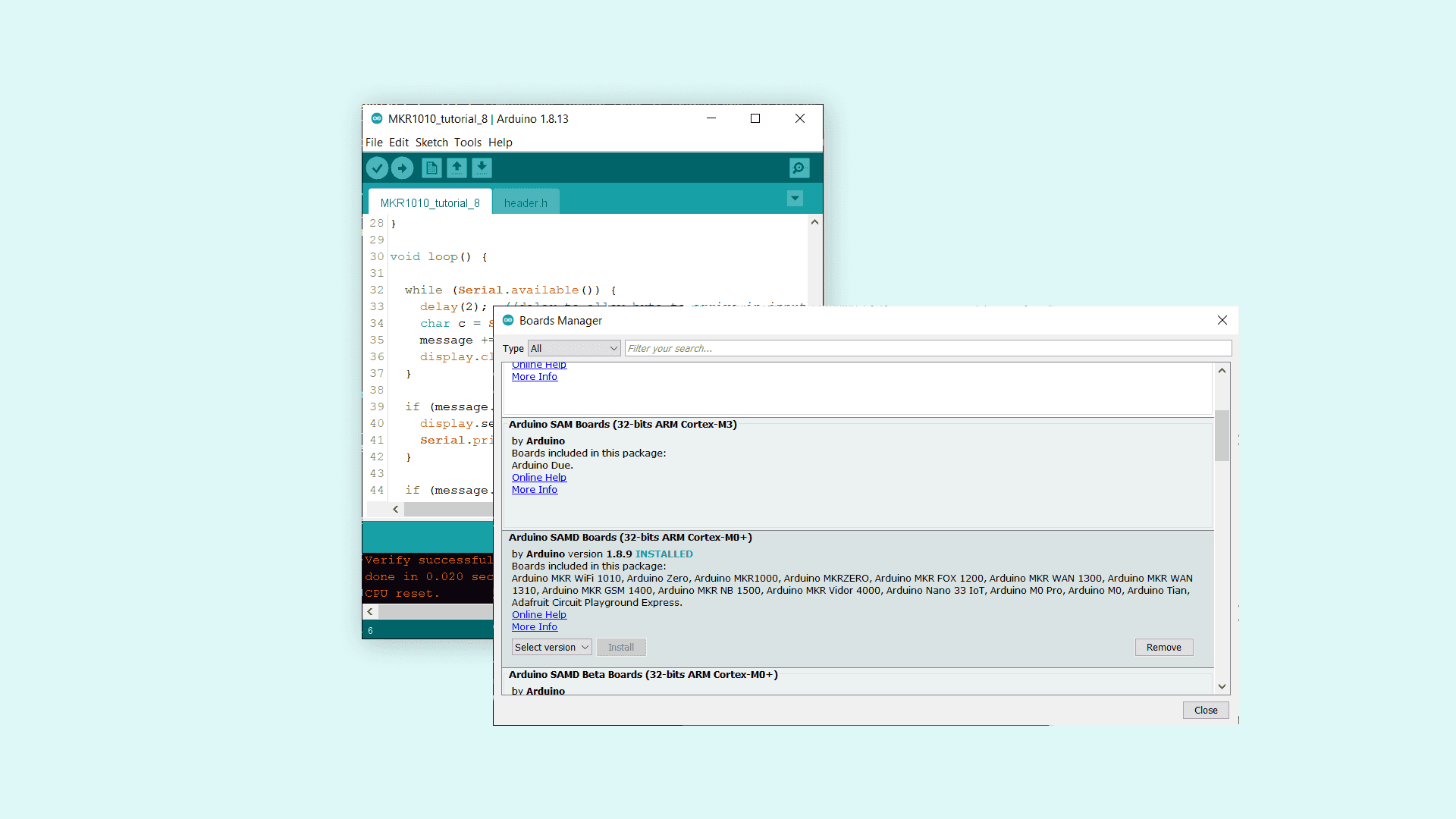 1. First, we need to make sure the drivers for the MKR WiFi 1010 board is installed properly. The Web Editor already comes equipped with these, but if we are using an offline editor, we will need to install it manually. This can be done by navigating to Tools > Board > Board Manager.... Here we need to look for the Arduino SAMD boards (32-bits Arm® Cortex®-M0+) and click on the install button.