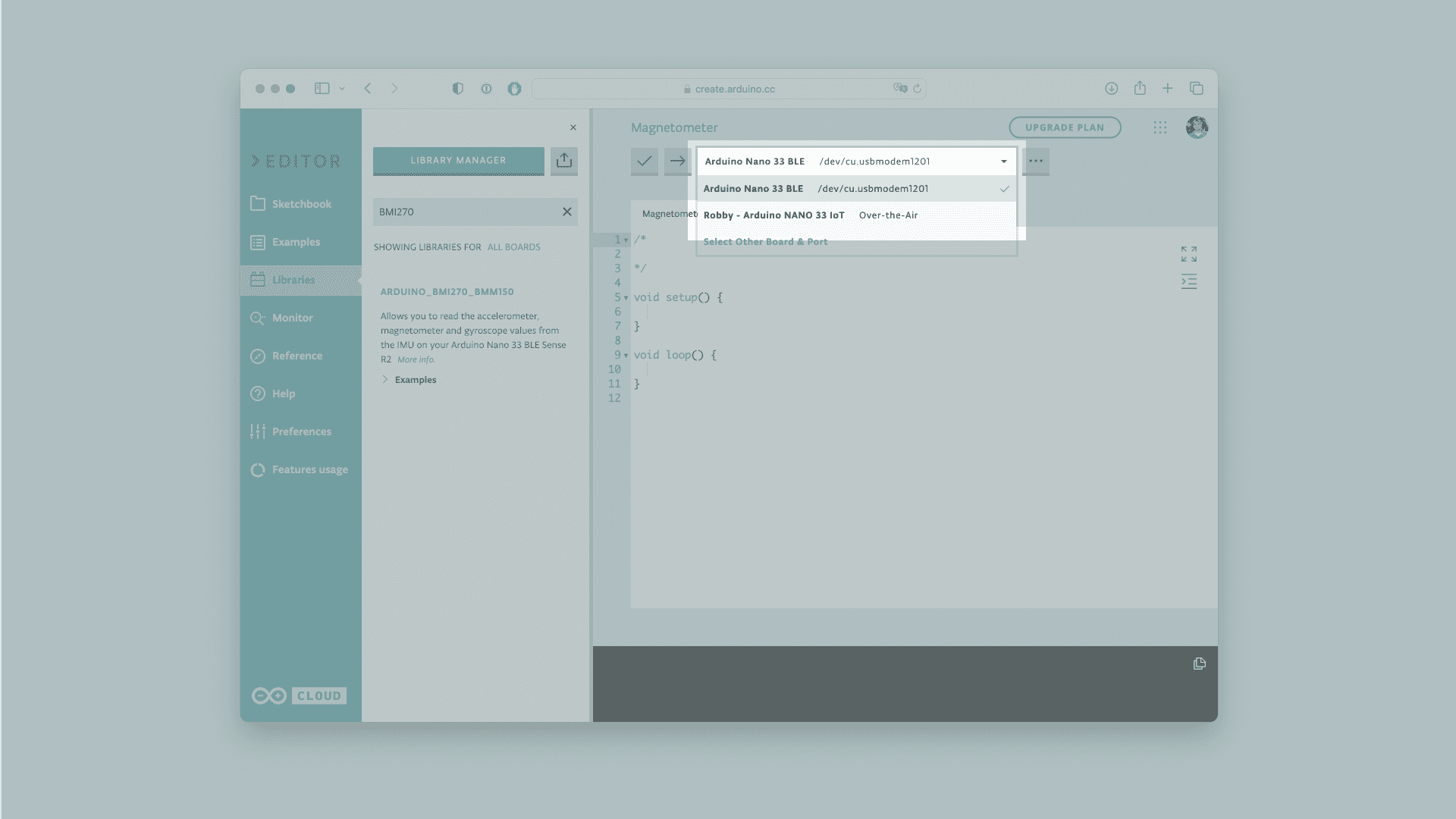 - In this tutorial we will use the Arduino Create Web Editor to program the board.