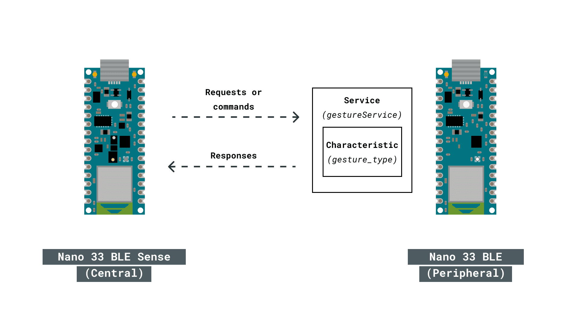 Now, let's use Bluetooth® Low Energy with Arduino. In this example, we are going to use two Arduino boards, the Nano 33 BLE and the Nano 33 BLE Sense to exchange information between them. One of the boards, the Nano 33 BLE Sense, is going to be set up as a central device while the other board, the Nano 33 BLE, is going to be set up as a peripheral device. The information that we are going to share between the boards will come from the embedded gesture sensor of the Nano 33 BLE Sense board. For this, we are going to create a service called gestureService that will have one characteristic called gesture_type.