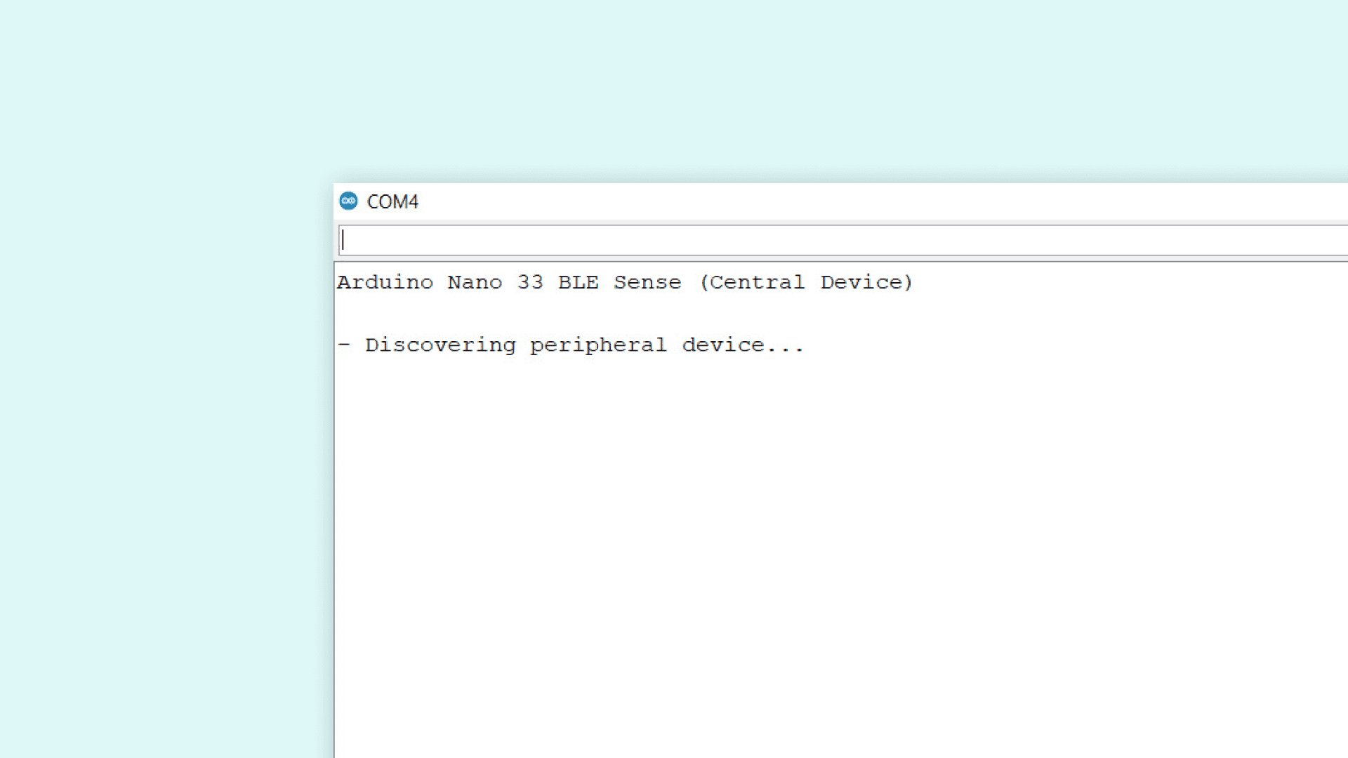 The peripheral device can also give us feedback through the serial port. We can verify with that feedback that the peripheral device (Arduino Nano 33 BLE) is working as expected by selecting the right port of the peripheral device and opening the Serial Monitor. In the Serial Monitor, we should see the following: