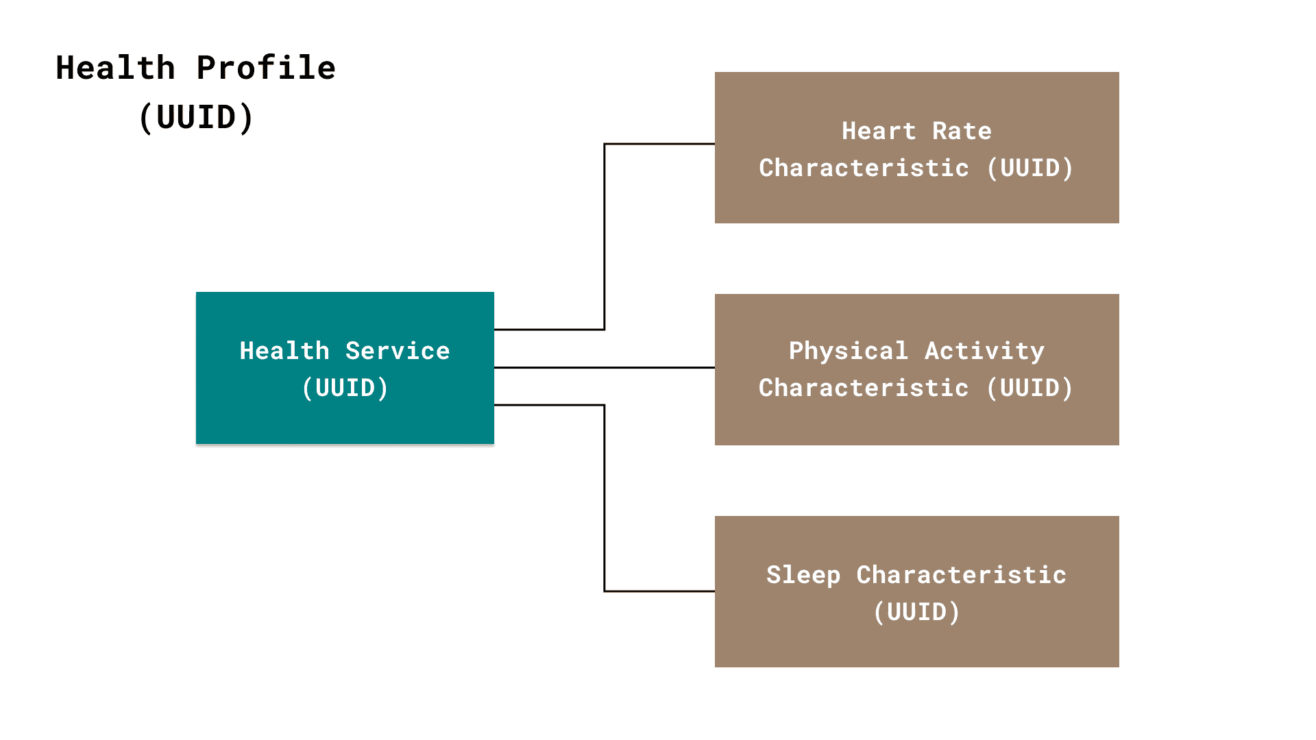 Within each service will exist a list of characteristics. Each one of these characteristics represents a unique capability of the central device. In the previous example, the health service would have three characteristics (heart rate, physical activity, and sleep pattern). Once the peripheral device discovers these characteristics, it can write information to, request information from, and subscribe to updates from these characteristics. Any characteristic, like the services, have a 16 bit long or 128 bit long UUID.
