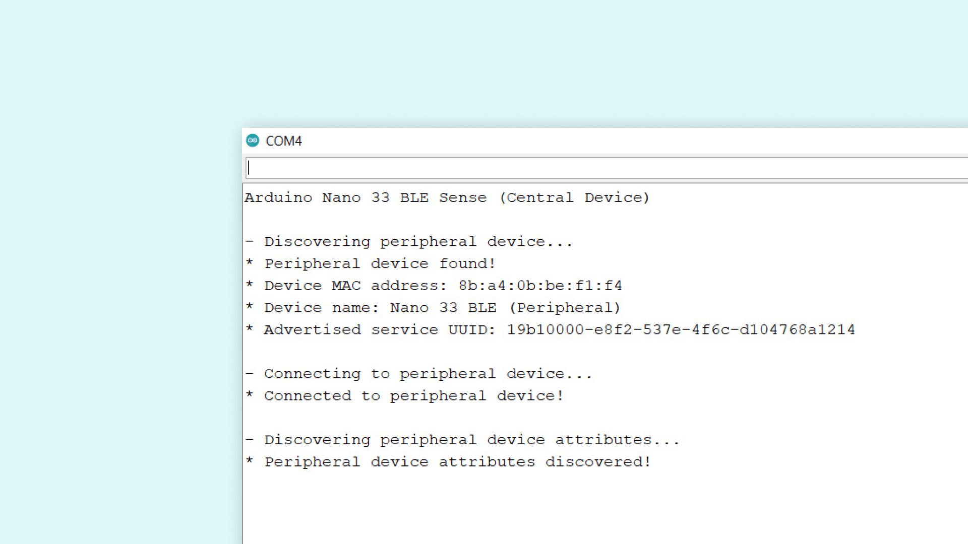 After turning on, the central device starts looking for a peripheral device with a specified service and characteristic. Once the peripheral device with the specified service and characteristic is found, in the Serial Monitor we should see the following:
