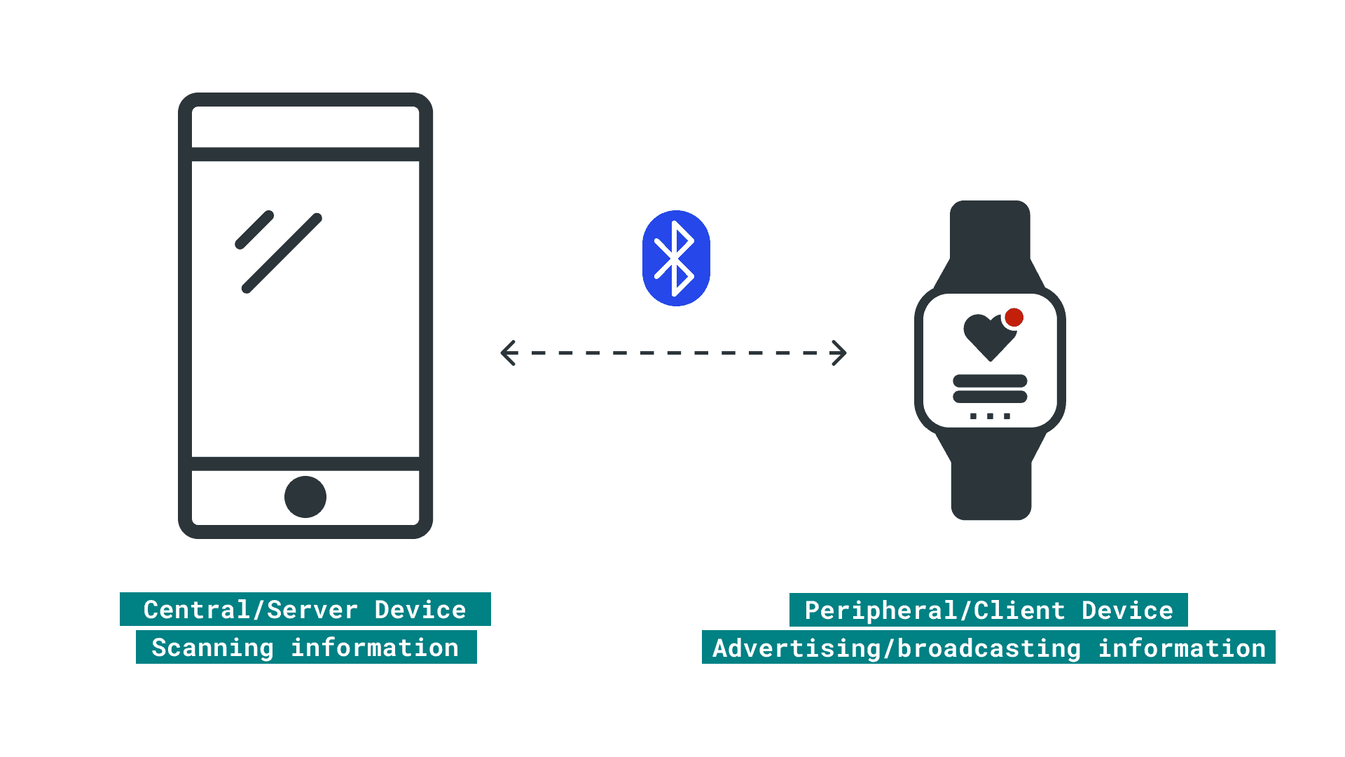To understand how does Bluetooth® Low Energy works, we need to talk about the roles and responsibilities of two devices that are connected through Bluetooth®. In any Bluetooth® connection, two roles that are being played: the central and peripheral roles. Devices with a central role are also call servers while devices with a peripheral role are also called clients.