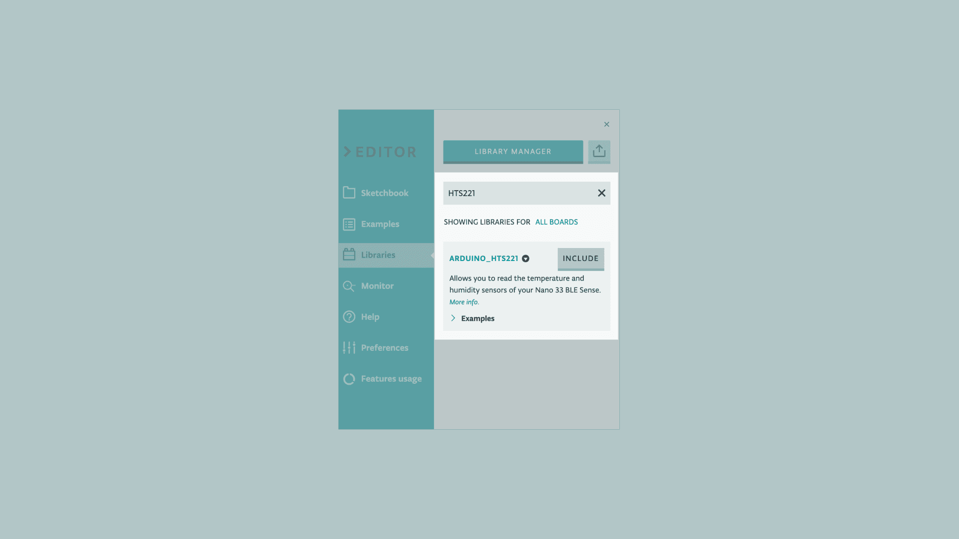 Let's start by opening the Arduino Web Editor, click on the Libraries tab, search for the HTS221 library, then in Examples, open the ReadSensors example. Once the sketch is open, rename it as Temp_Humidity.