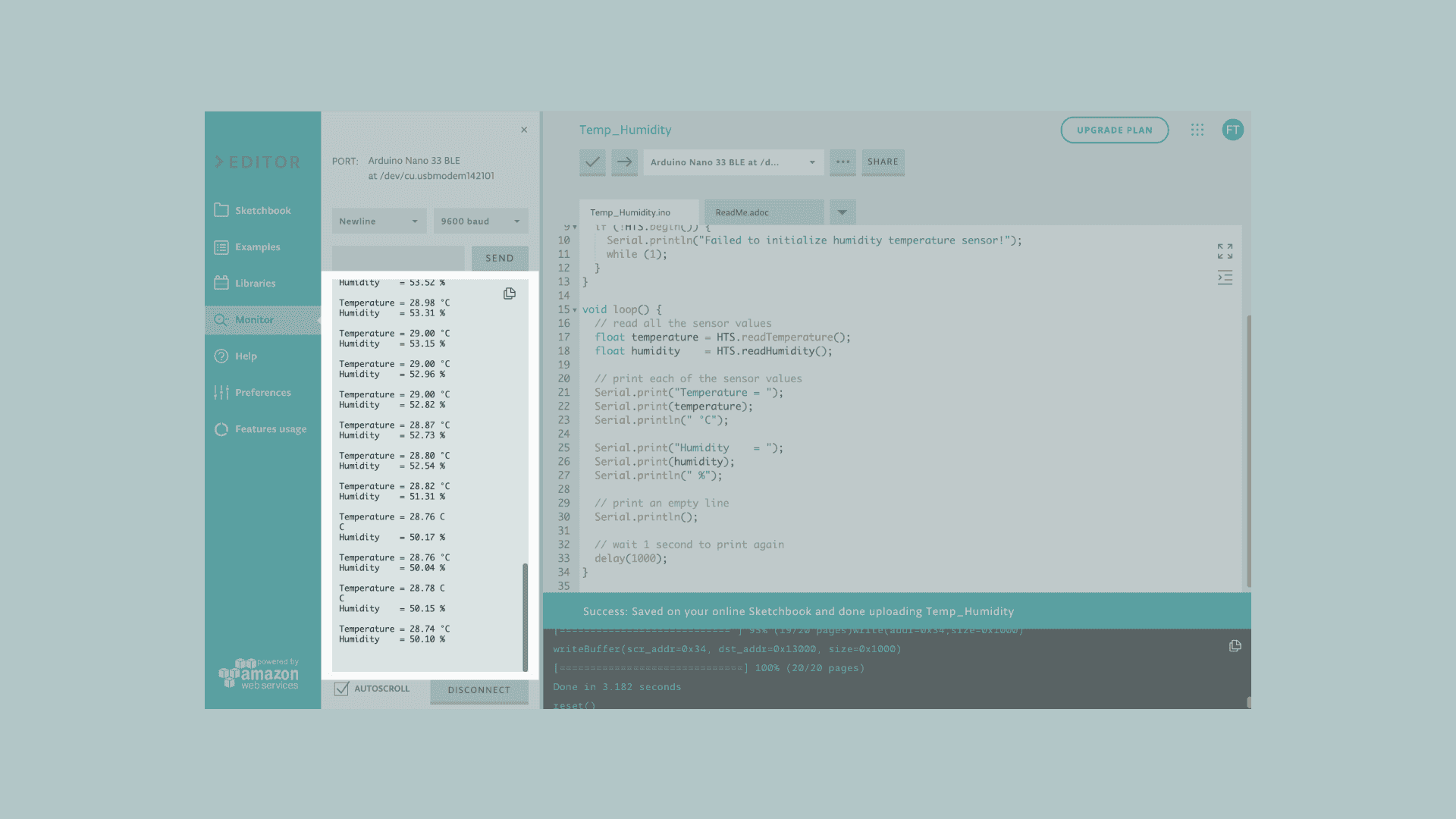 4 This example reads data from the on-board HTS221 sensor of the5 Nano 33 BLE Sense and prints the temperature and humidity sensor6 values to the Serial Monitor once a second.7