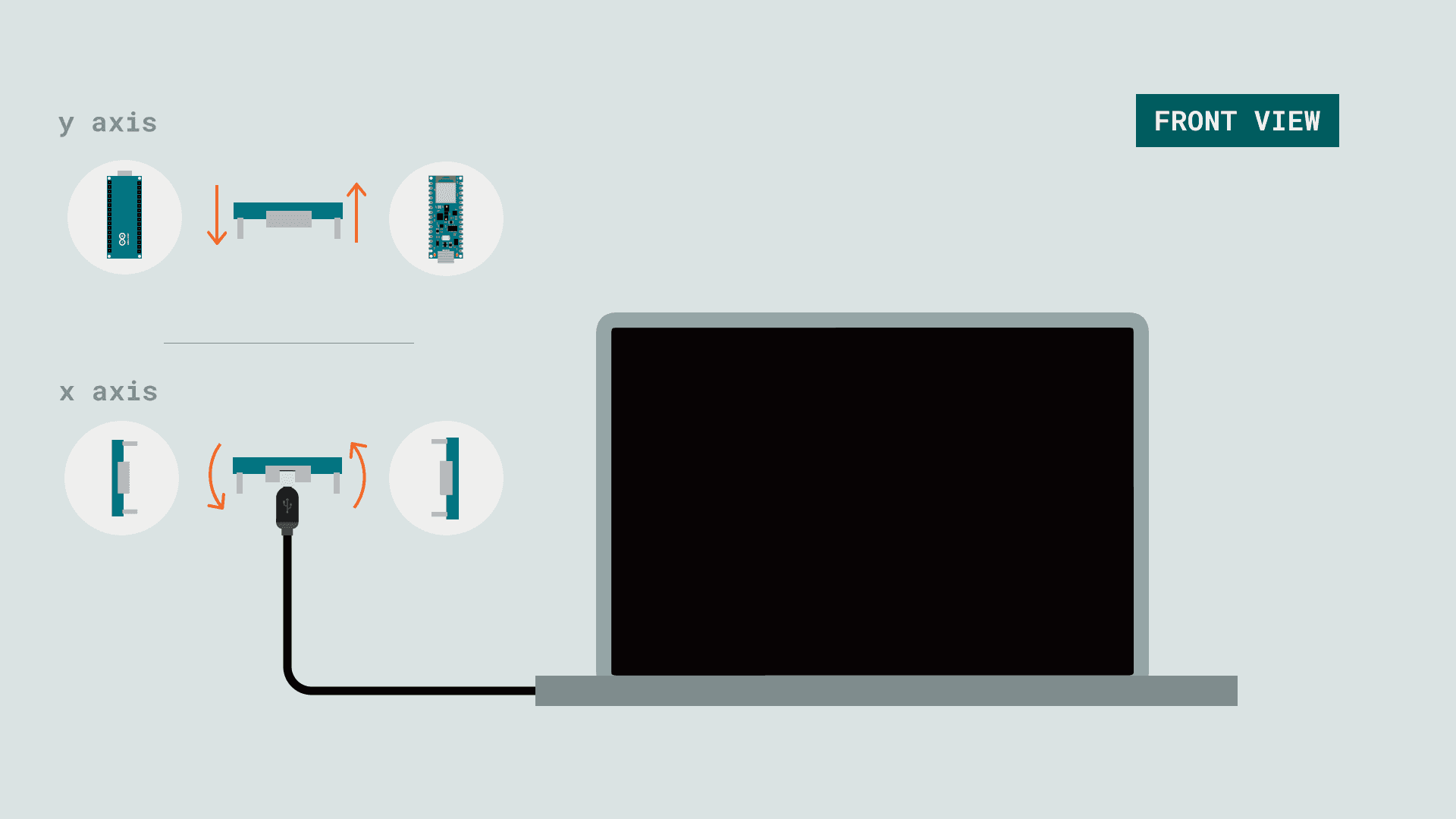 IMU.readAcceleration initialization, we add four if statements for the board's different positions. The statements will calculate the direction in which the board will be tilting towards, as well as provide the axe's degree values.1if(x > 0.1){2 x = 100*x;3 degreesX = map(x, 0, 97, 0, 90);4 Serial.print("Tilting up ");5 Serial.print(degreesX);6 Serial.println(" degrees");7 }8 if(x < -0.1){9 x = 100*x;10 degreesX = map(x, 0, -100, 0, 90);11 Serial.print("Tilting down ");12 Serial.print(degreesX);13 Serial.println(" degrees");14 }15 if(y > 0.1){16 y = 100*y;17 degreesY = map(y, 0, 97, 0, 90);18 Serial.print("Tilting left ");19 Serial.print(degreesY);20 Serial.println(" degrees");21 }22 if(y < -0.1){23 y = 100*y;24 degreesY = map(y, 0, -100, 0, 90);25 Serial.print("Tilting right ");26 Serial.print(degreesY);27 Serial.println(" degrees");28 }Lastly, we