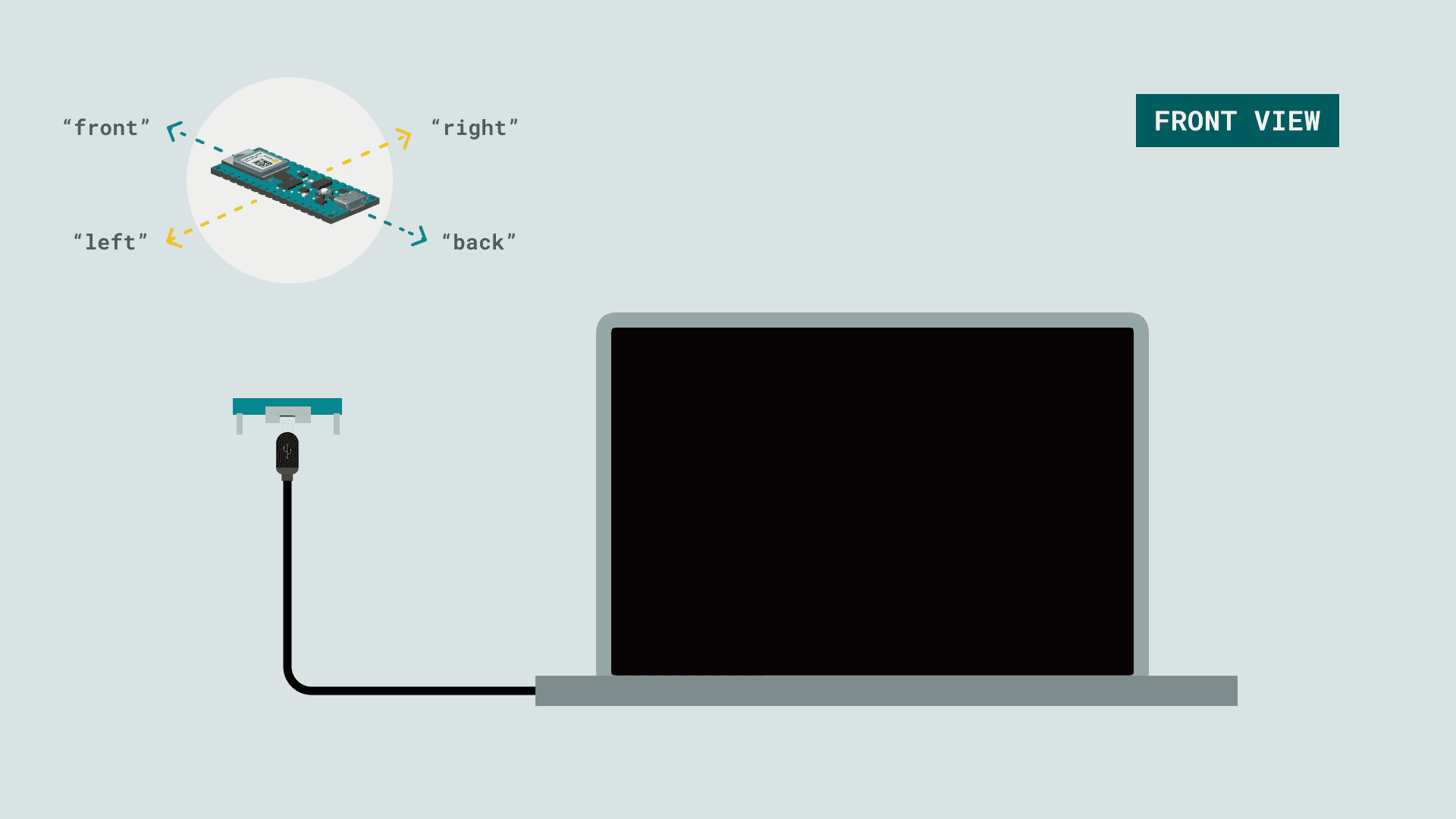 In this example, we will use the gyroscope as an indicator for the direction of the force that is applied to the board. This will be achieved by swiftly moving the board for an instant in four directions: forward, backward, to the left and to the right. The results will be visible through the Serial Monitor.