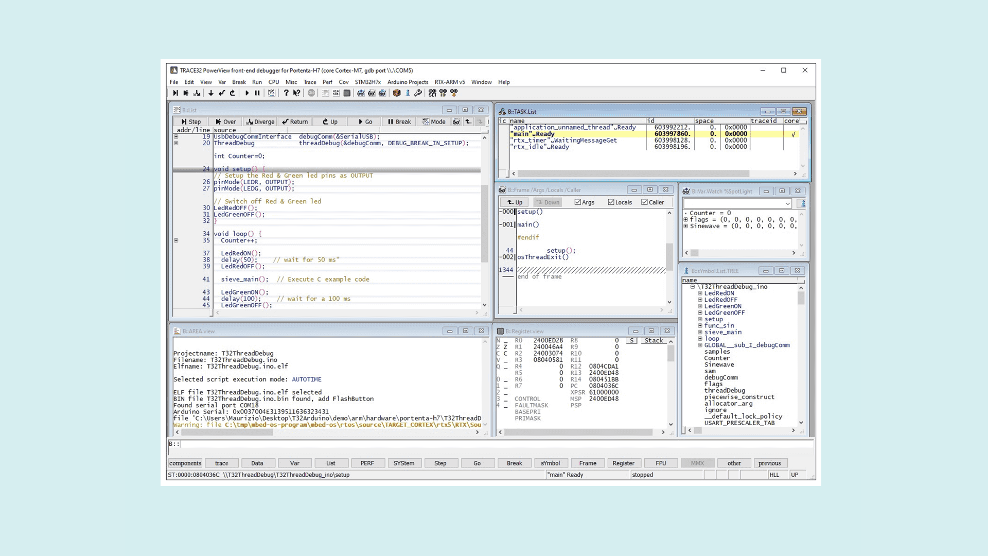 T32ThreadDebug.ino file in the Arduino IDE, build and flash it. Flashing is also possible with TRACE32 tool.IMPORTANT: If you choose to program the Flash within the Arduino IDE, do not close the IDE after programming; leave it open. This is very important because, if you close the IDE, it cleans up the temporary build directory which includes the ELF file.